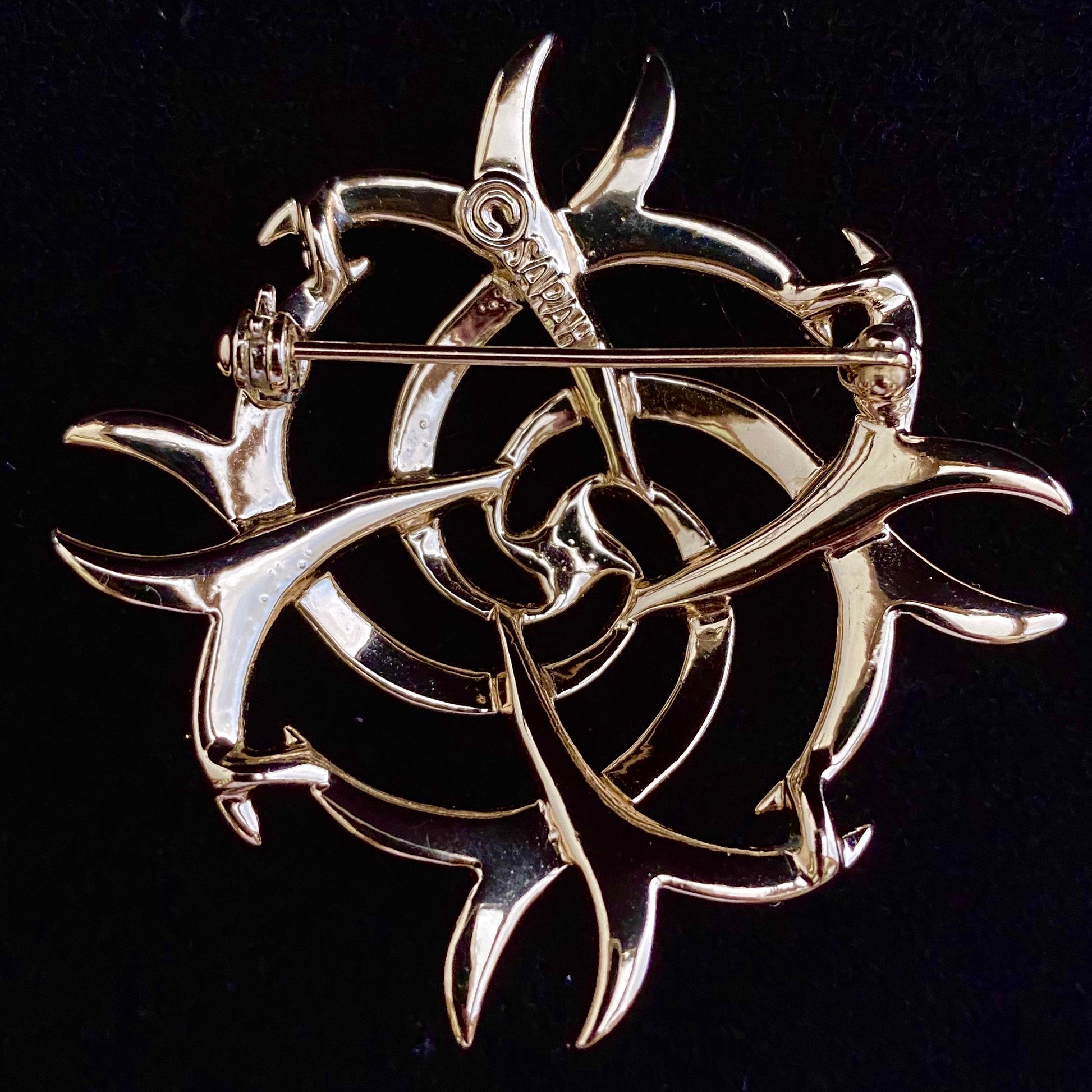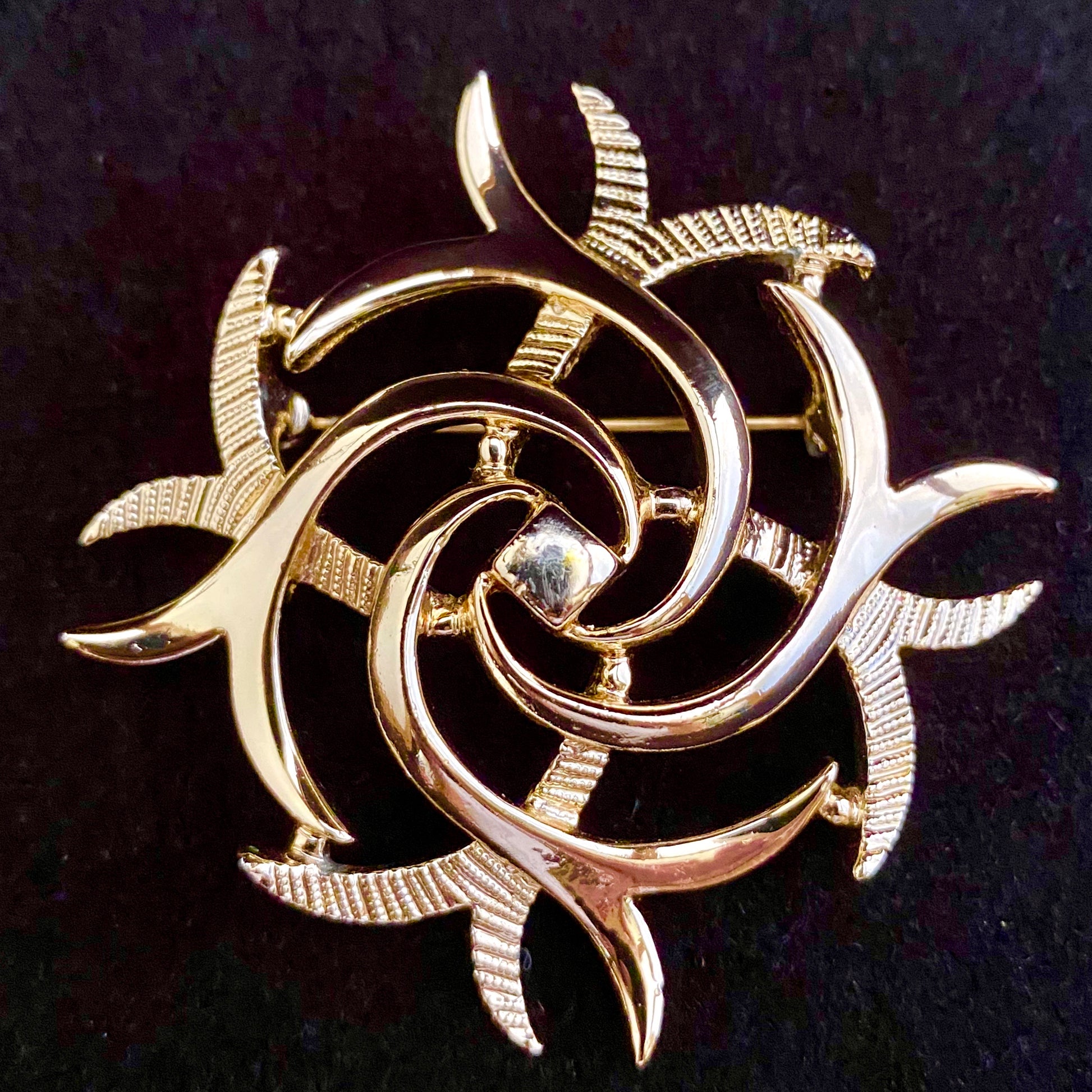 The Sarah Coventry Flirtations brooch was introduced in 1974. This unusual brooch features both textured and polished gold-tone pieces swirled together to form a unique abstract design. The brooch is signed ©SARAH. It measures approximately 2” in diameter and is in excellent vintage condition.