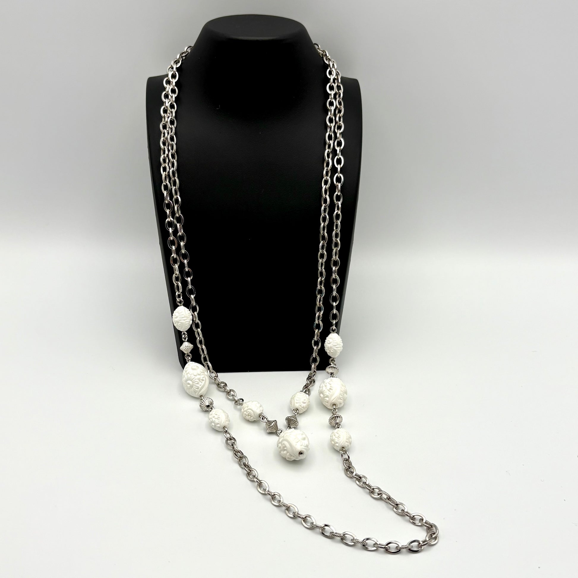 The Sarah Coventry Summer Flirt Collection was introduced in 1976. The necklace features two silver-tone cable chains. The outer chain has a group of 3 oval, molded, floral, white plastic beads on both sides of chain. Each group is made up of a ½” white bead, a silver-tone textured bicone bead, a ¾” white bead, another bicone bead, and a ½” white bead. The inner necklace has the same chain but has a center design of two ½” beads, 2 bicone beads and the ¾” bead that dangles in the middle. The necklaces measures approximately 29” and 22” and close with spring ring clasps. The set is signed SARAH COV on the diamond-shaped hang tag. This necklace set is in excellent vintage condition