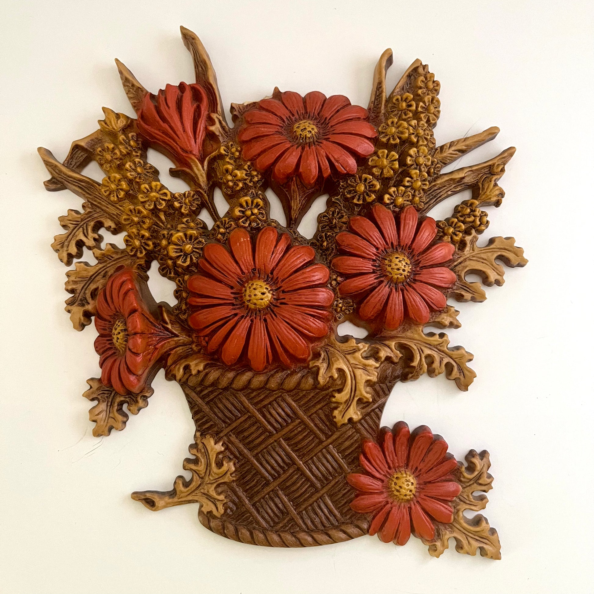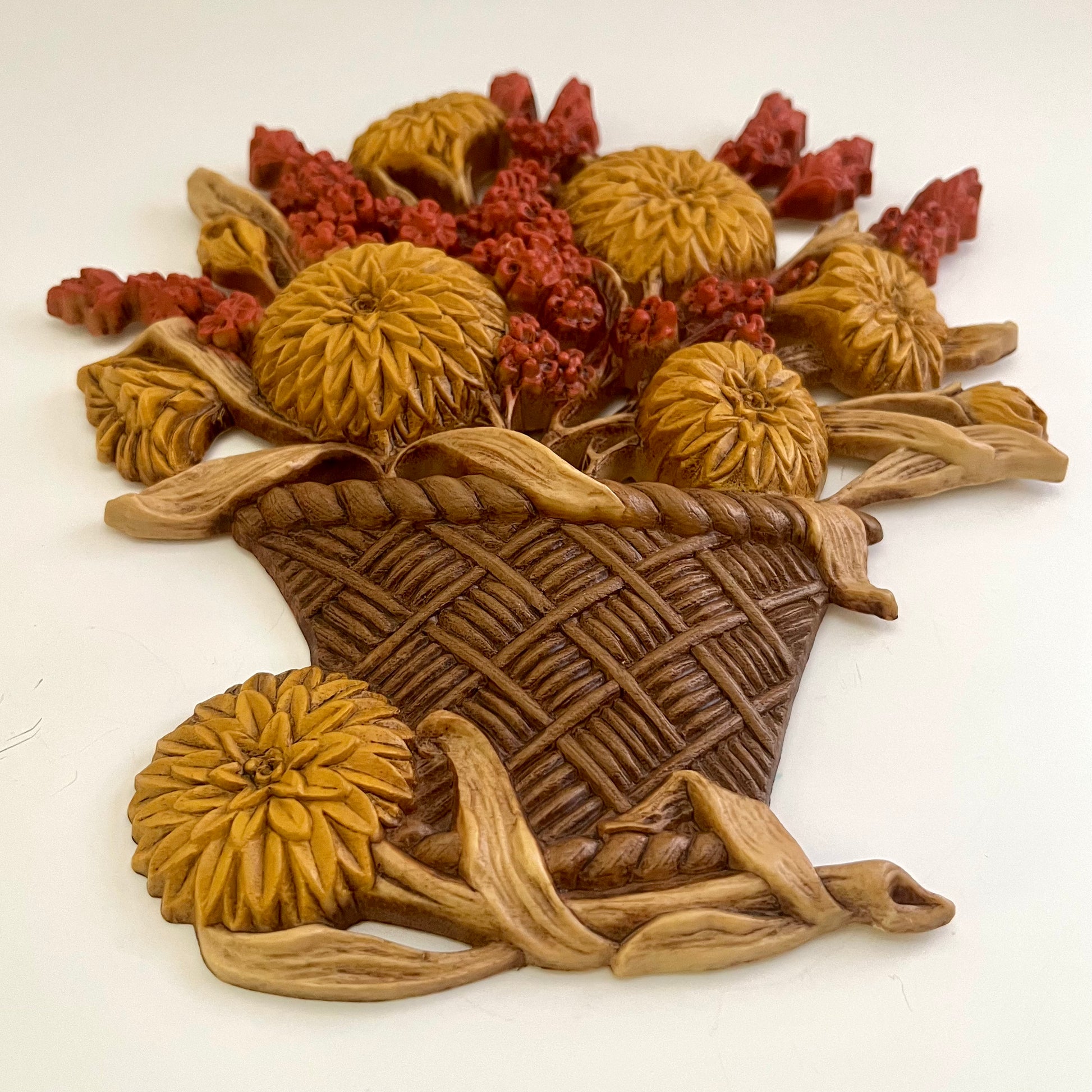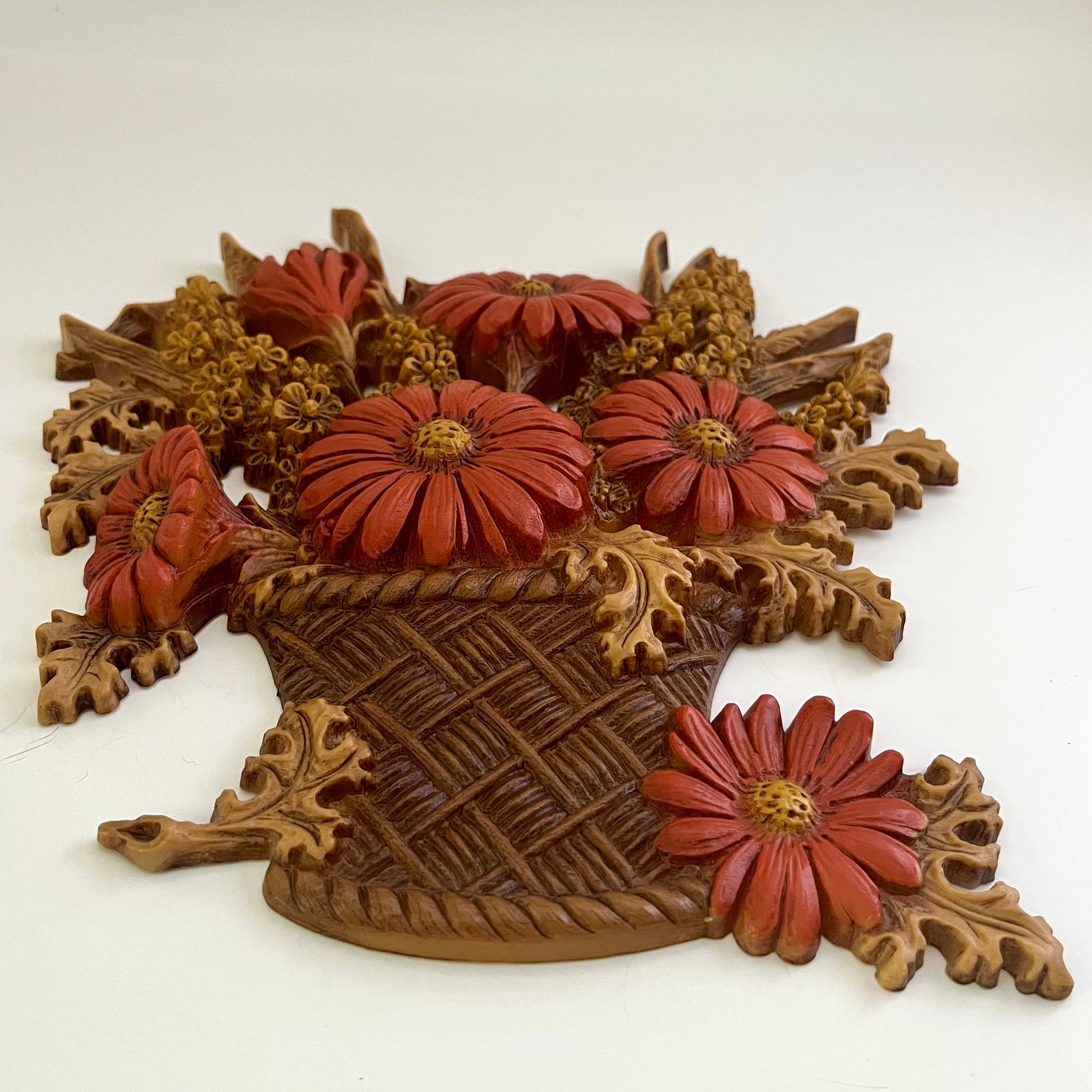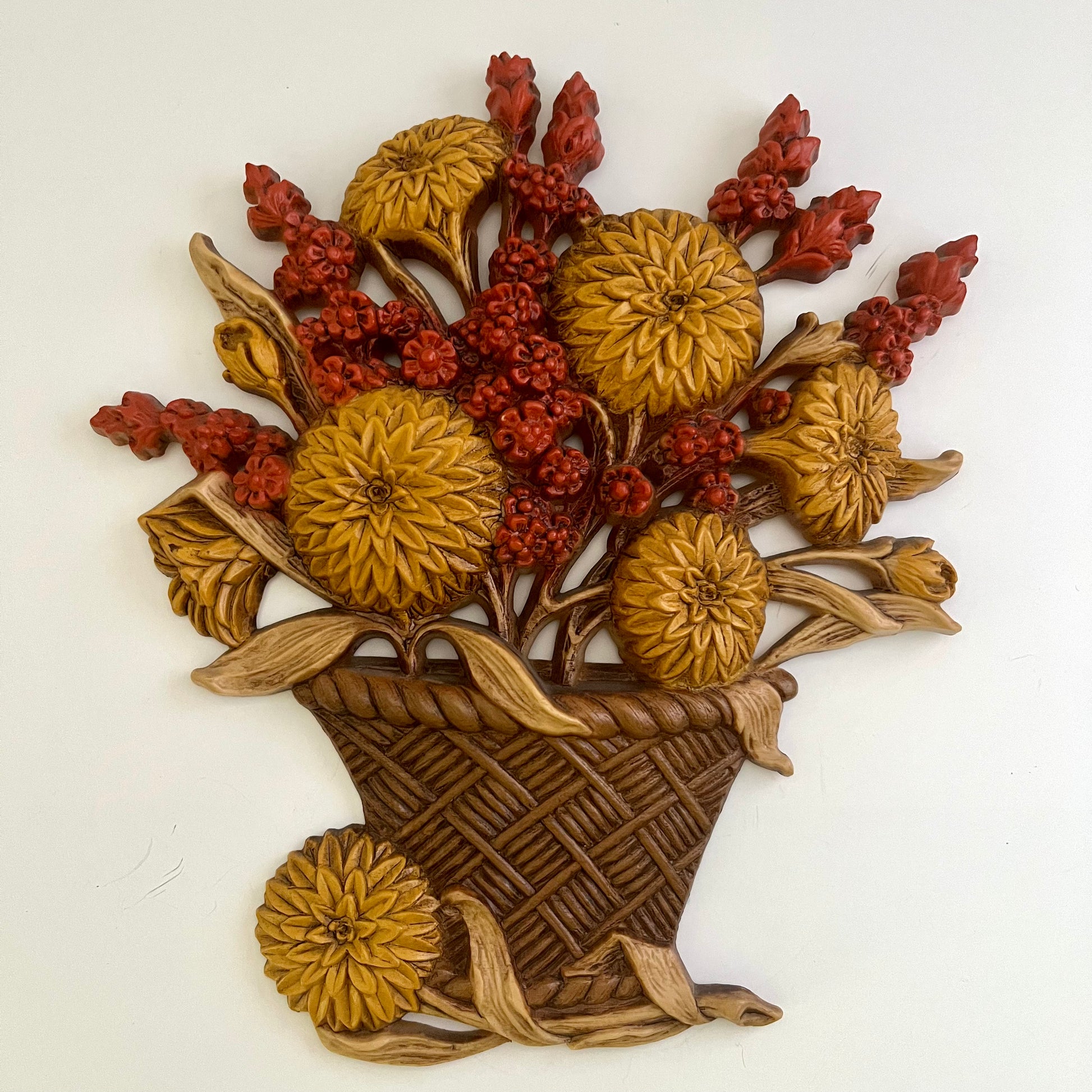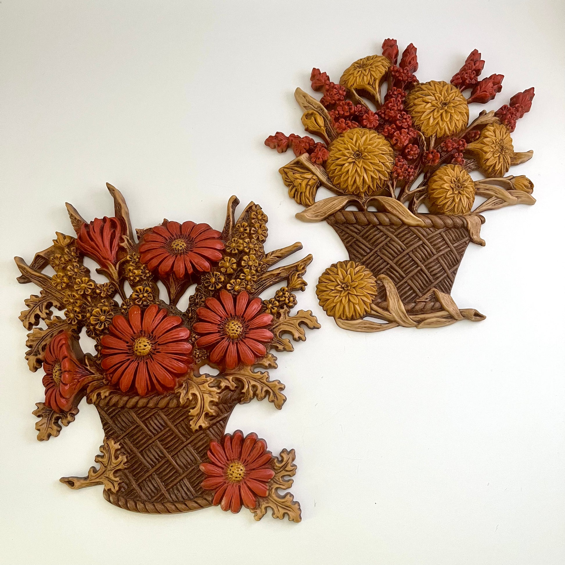 This pair of 1977 Autumn wall decor was made Burwood. The yellow flower basket is approximately 9 1/4" L x 8 1/4" W and the orange flower basket is 9 1/4" L x 8 1/2" H. They are in excellent vintage condition.*
