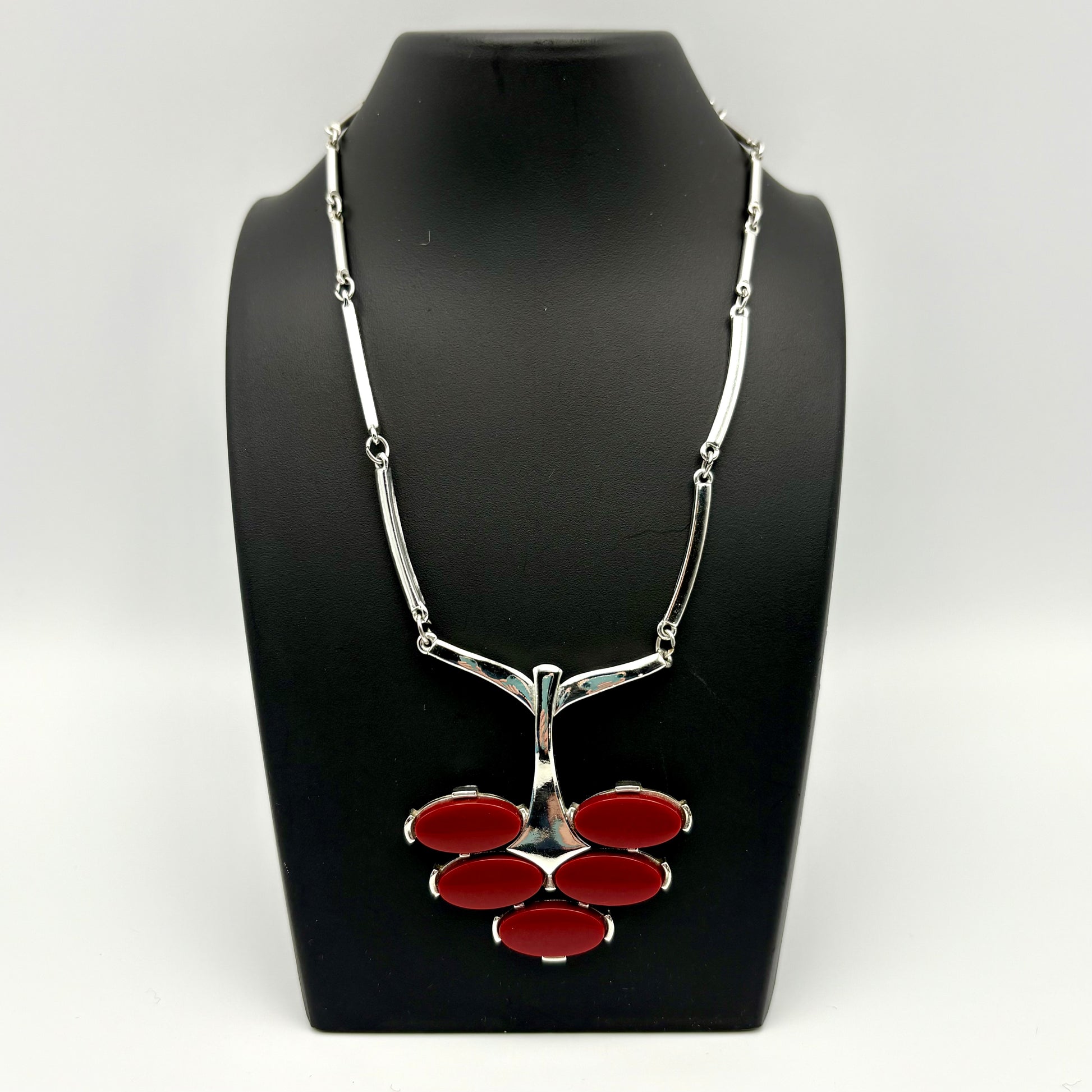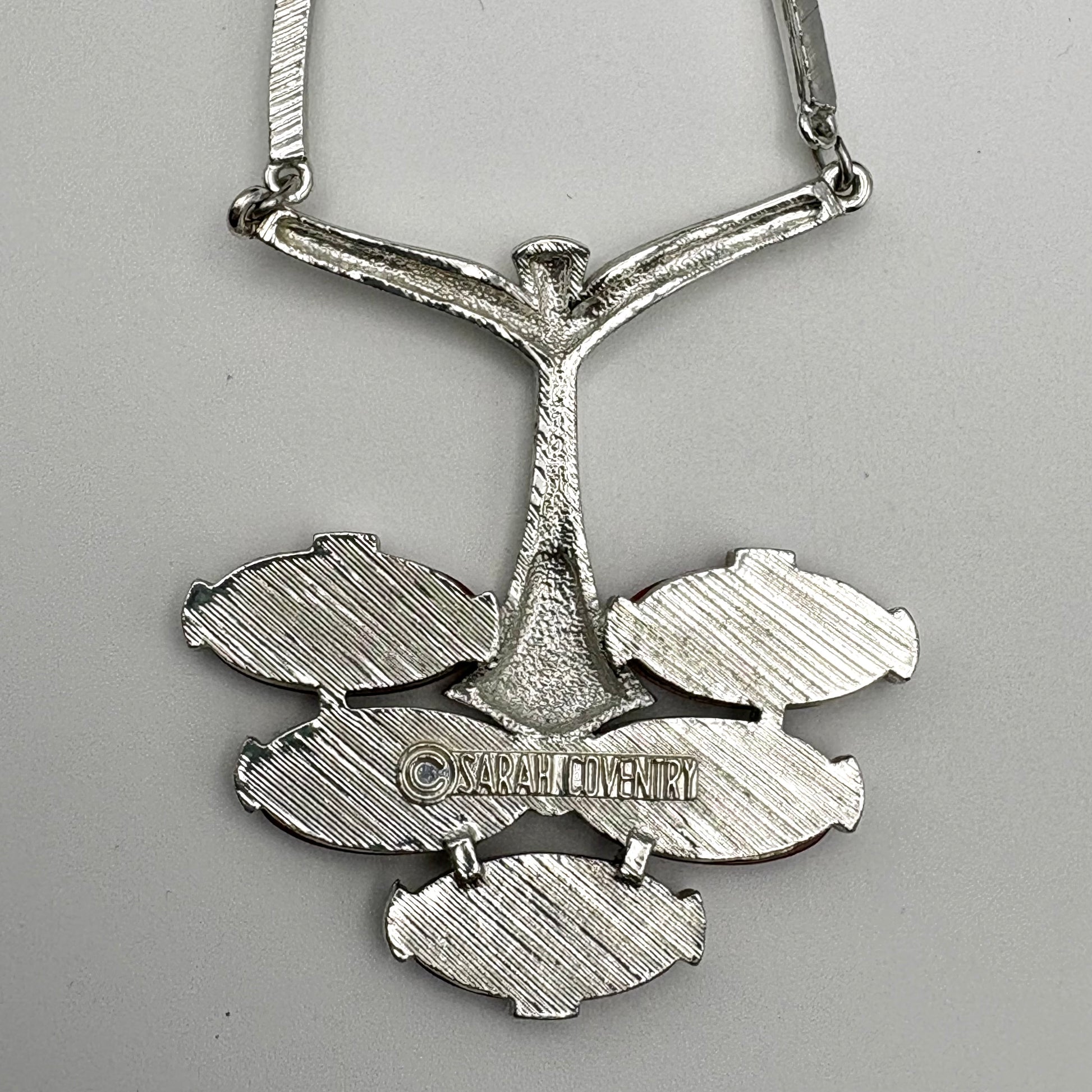 The Sarah Coventry Continental jewelry line was introduced in 1977. The unusual, mod style necklace from this line features 6 burgundy thermoset ovals set in a polished silver-tone setting. The polished chain consists of silver-tone curved pieces and tube beads. The necklace measures approximately 17” and closes with a spring ring clasp. It is signed © SARAH COVENTRY on the back of the 2” pendant. This necklace is in excellent vintage condition.