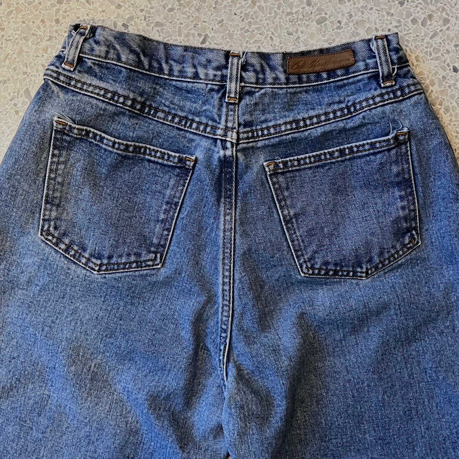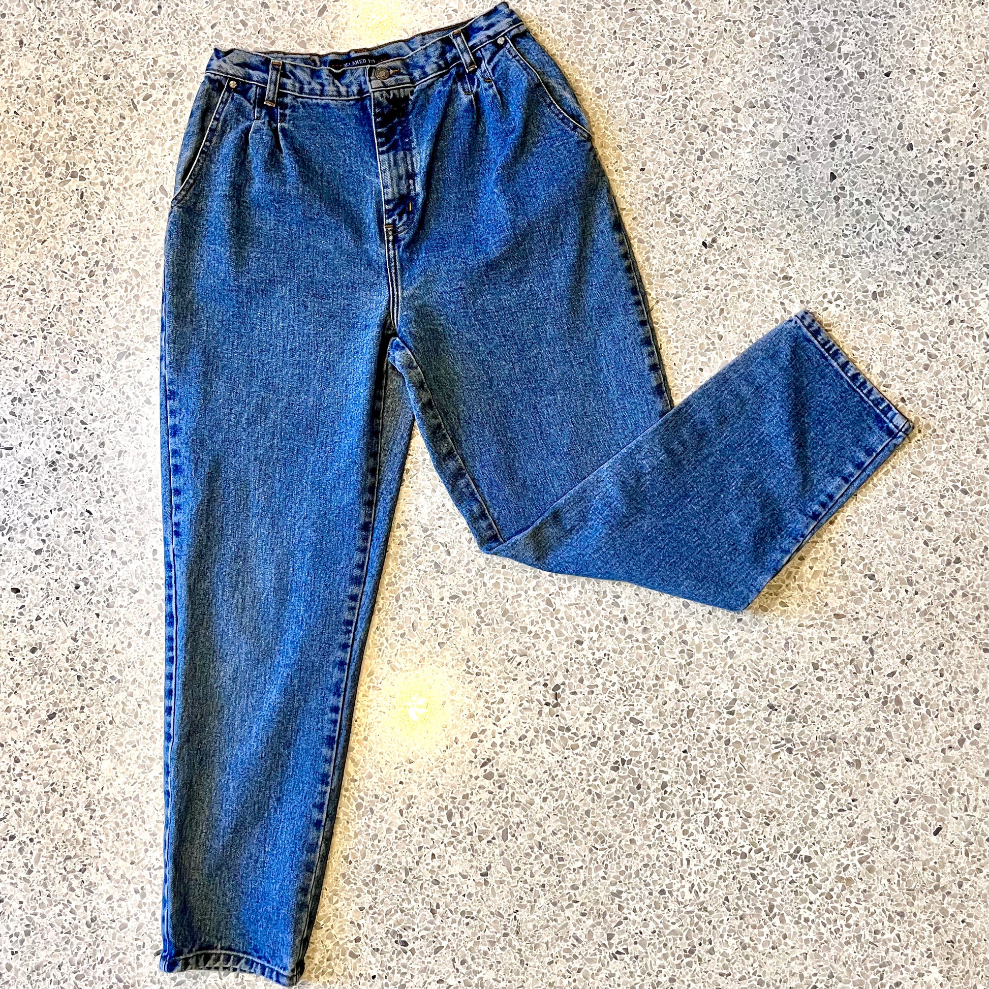 Style: These jeans are high waisted with a pleated front. They are baggy fit with slightly tapered leg.