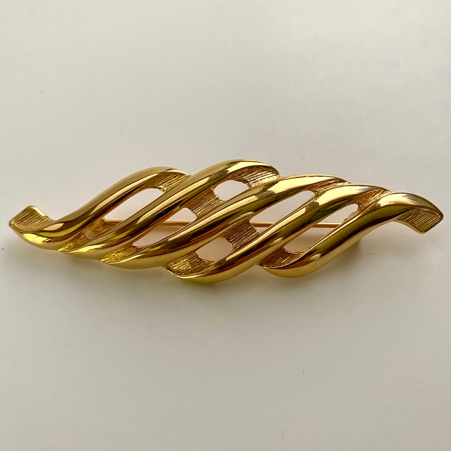 This Monet brooch is a modern abstract design. It consists of polished and textured swirls that resemble ribbons which flow in a unique attractive shape. The brooch is signed ©Monet. It measures approximately 2” x 7/8” and is in excellent vintage condition.