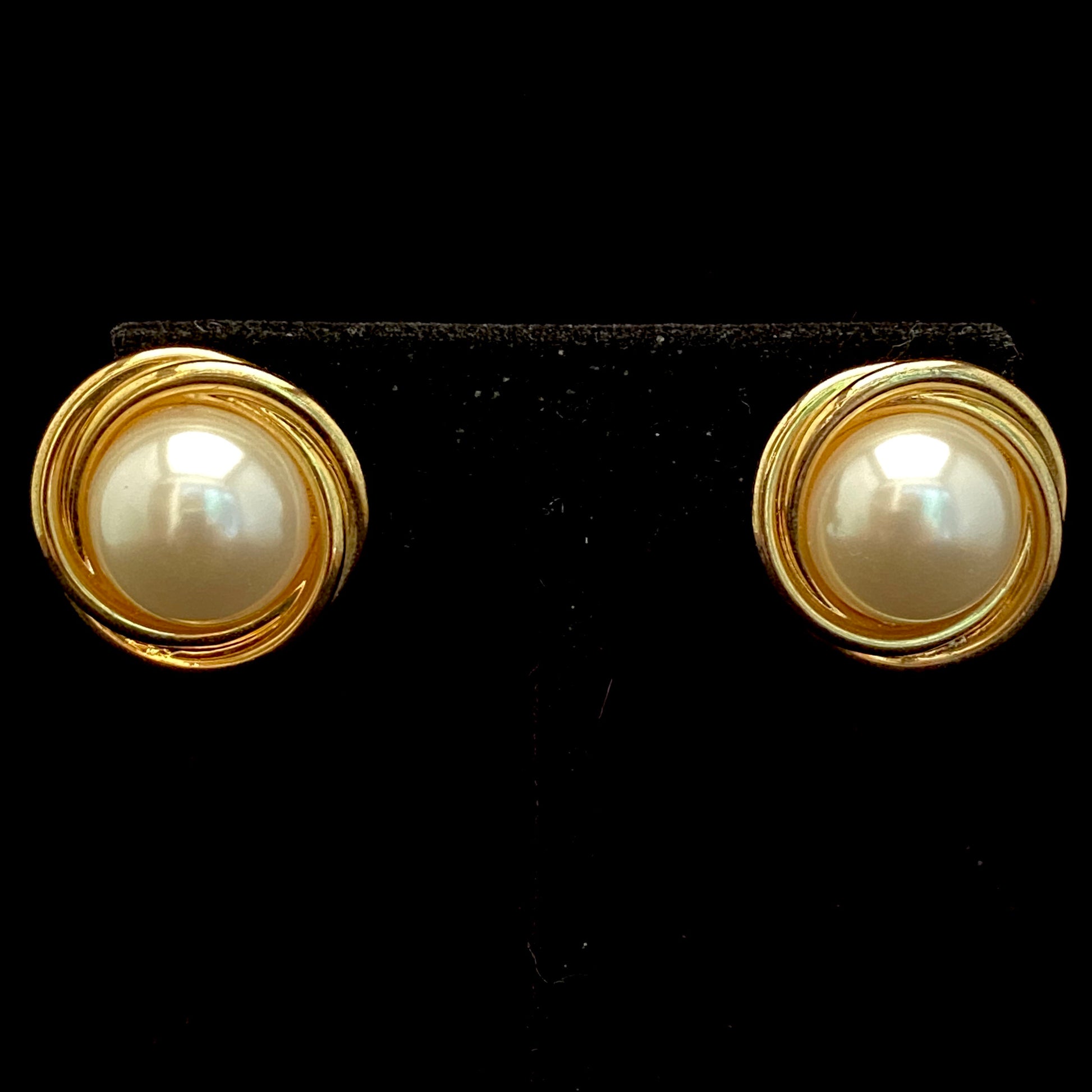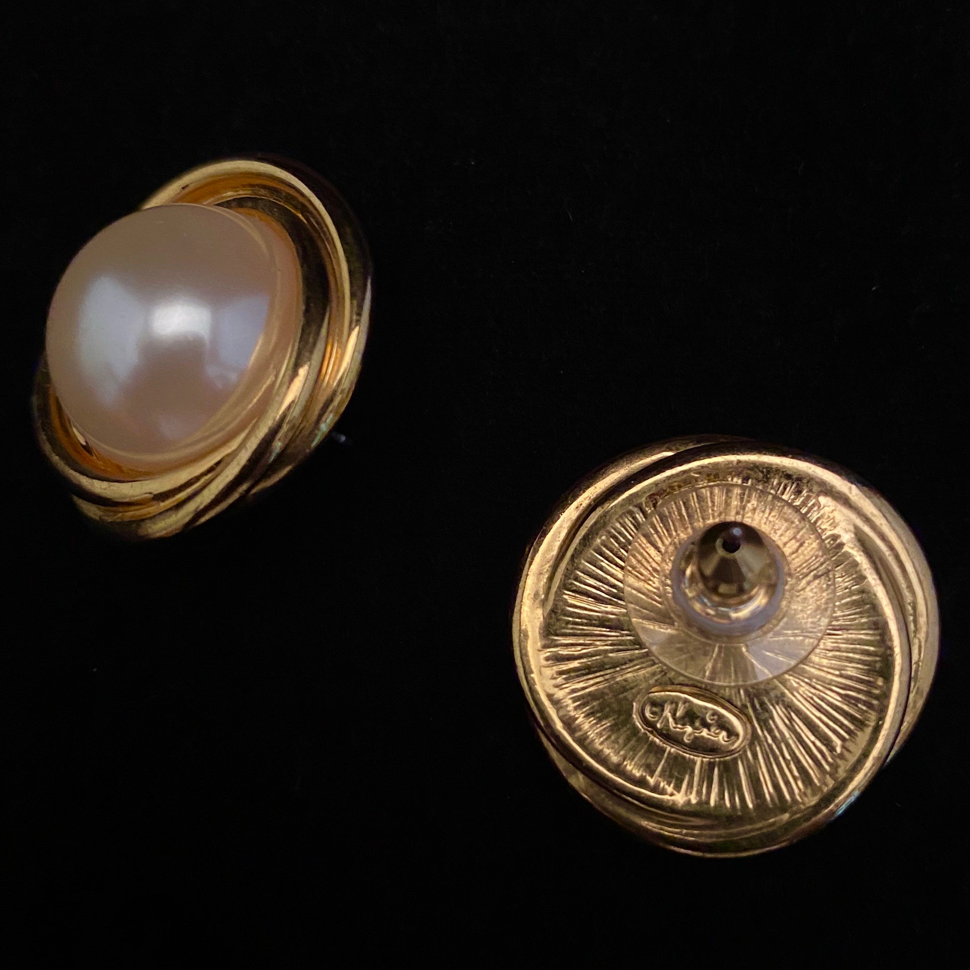 Napier presented these elegant faux pearl earrings. They feature a round faux pearl framed by polished, gold-tone overlapping circles. The earrings are for pierced ears and are marked ©Napier. They measure approximately 1” in diameter and are in excellent vintage condition.