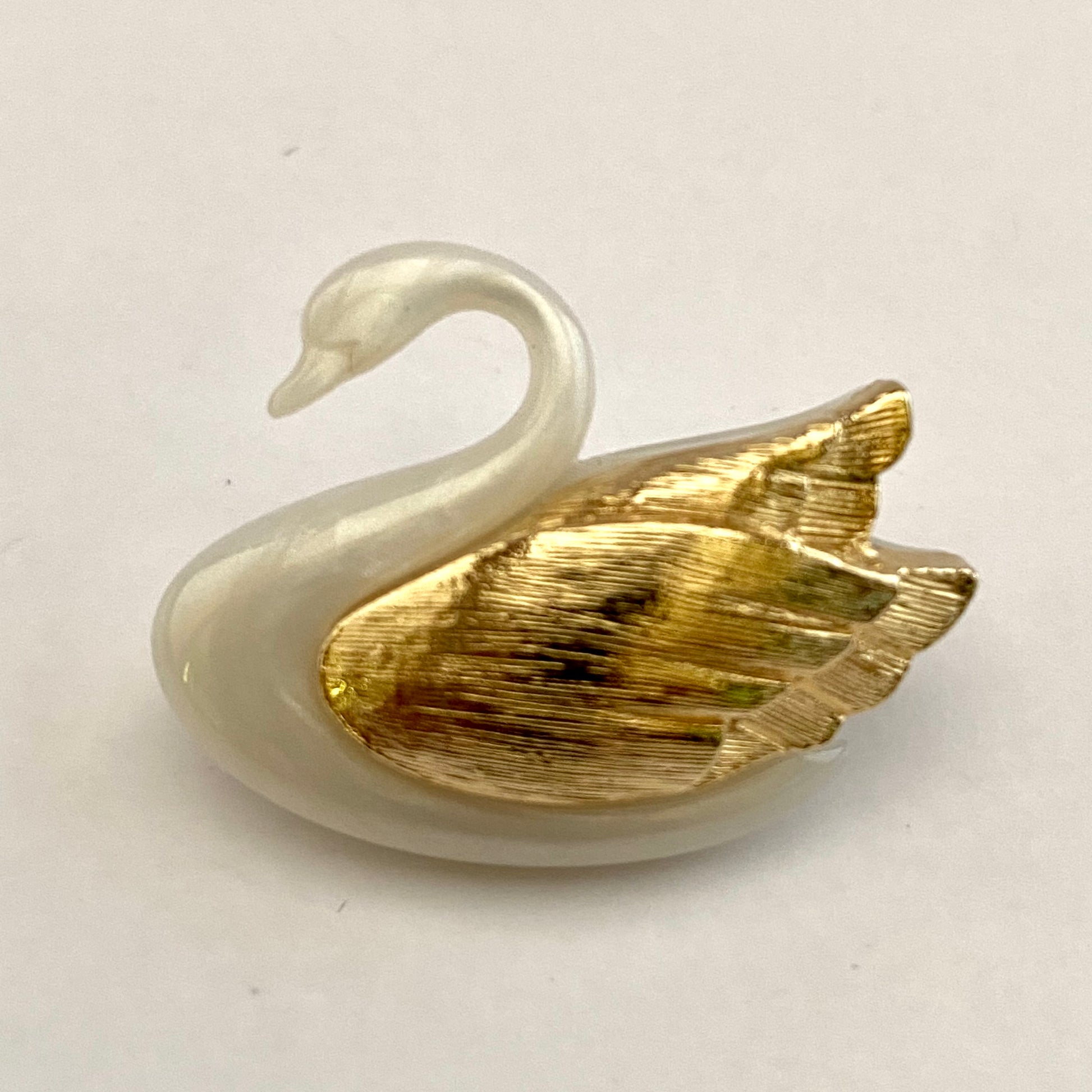 The Graceful Swan pin was introduced by Avon in 1985.This pretty pin features a graceful, pearl white plastic swan accented by beautiful, textured gold-tone wings. It is signed ©AVON. The pin measures approximately 1¼” W x 7/8” H and is in excellent vintage condition.