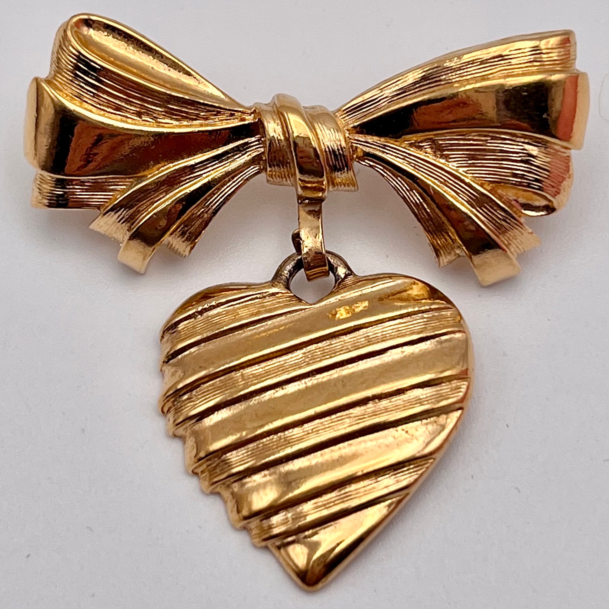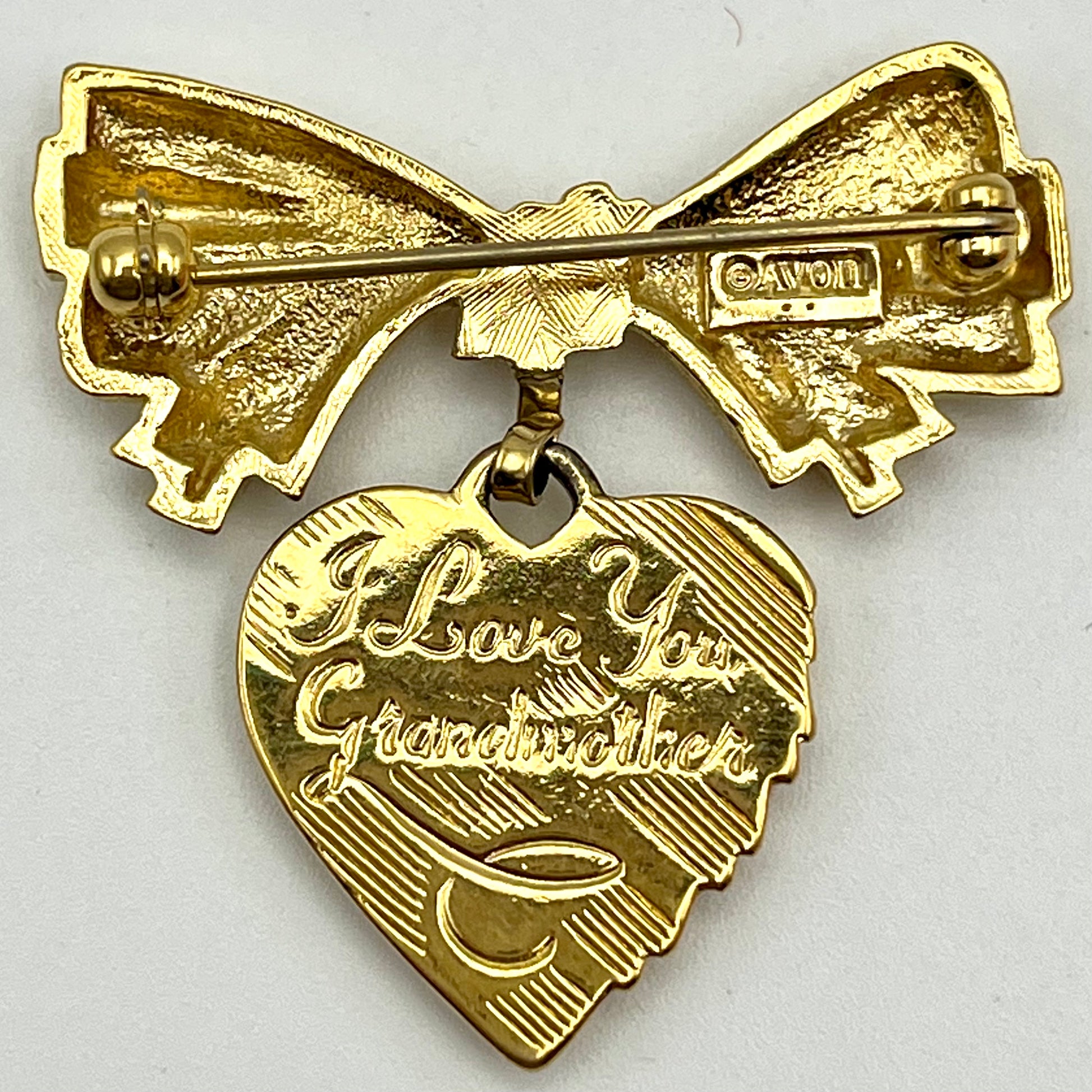 Avon introduced the Sentiment brooch in 1986. This elegant brooch is a beautifully textured gold-tone heart dangling from an ornate bow. The back of the heart is inscribed “I Love You Grandmother”. The brooch is signed ©AVON on the back of the bow. The brooch measures approximately 1½” H x 1½” W and is in excellent vintage condition.