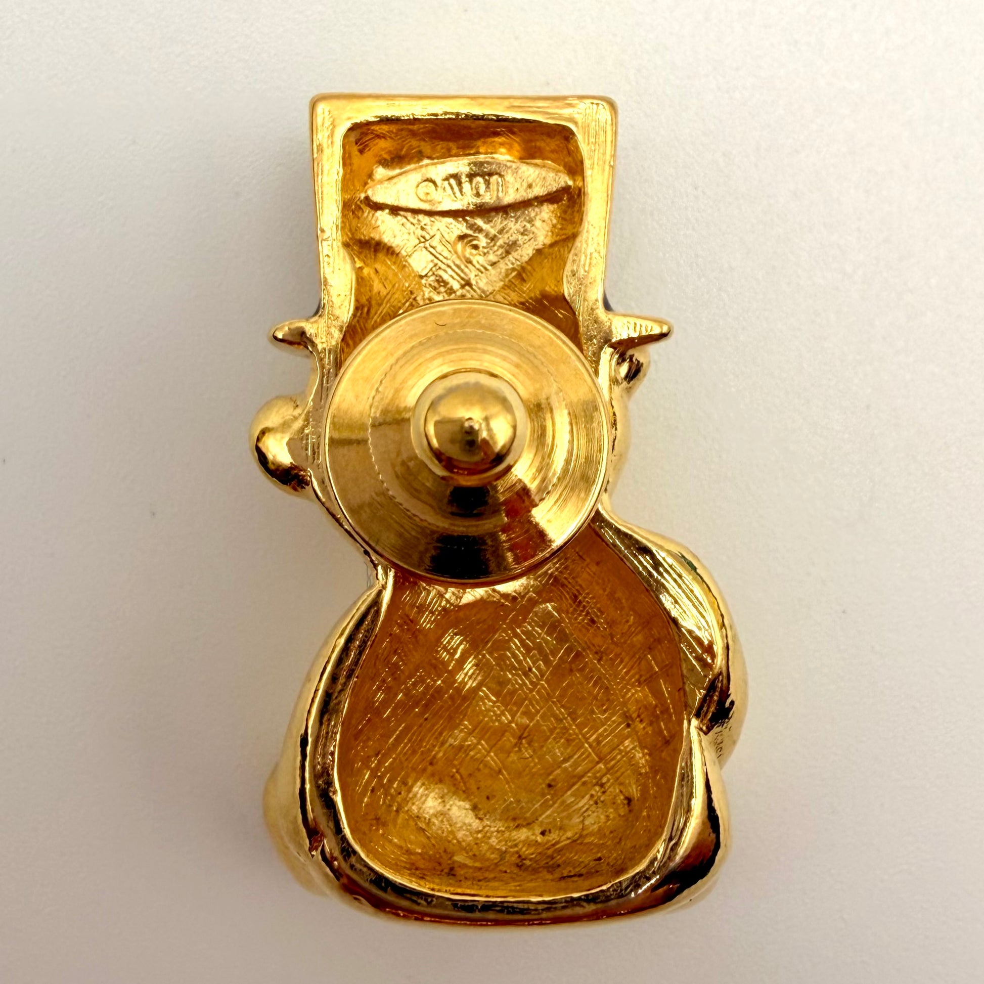 The Stars and Stripes Bear Tac Pin was introduced by Avon in 1996. This cute, three dimensional, polished gold-tone wears a patriotic hat and tie. The hat and tie are accented with red, white, and blue enamel stripes to complete the design. The pin measures approximately 1½” H x ¾” W and closes with a gold-tone tac pin. It is signed ©AVON on the back. This bear is in excellent vintage condition.