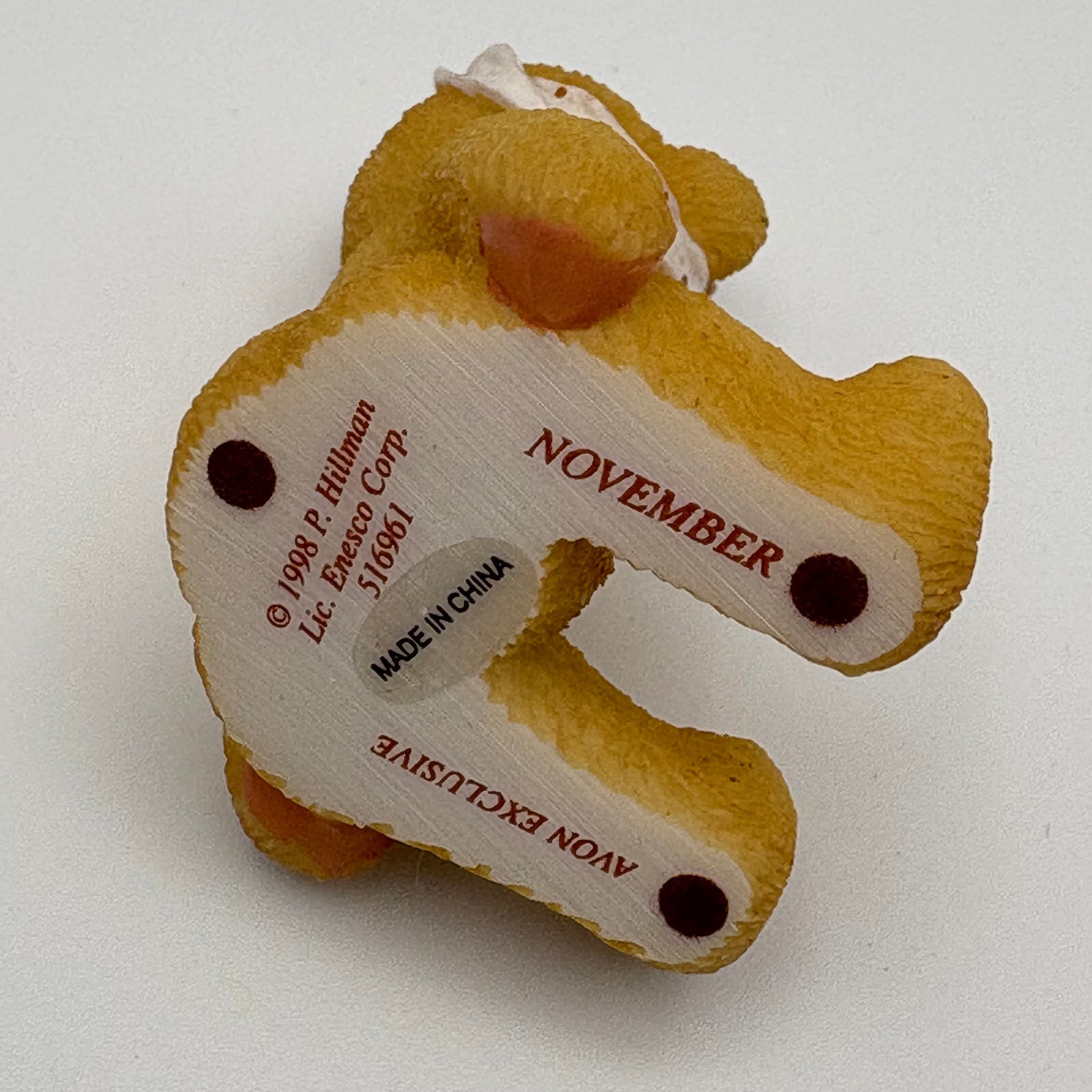 This sweet little teddy bear is one of the Cherished Teddies collection based on the illustrations of Patricia Hillman. It is an Avon Exclusive made in 1998 by Enesco. This cutie wears nothing but a pink polka dot hair bow with a pink rhinestone in the center. How cute! The resin bear measures approximately 1¾” H x 1½” W x 1½” D. It is signed several places on the bottom. The marks are ©1998 P. Hillman Lic. Enesco Corp, November, and Avon Exclusive. This Cherished Teddy Bear is in excellent vintage condition.