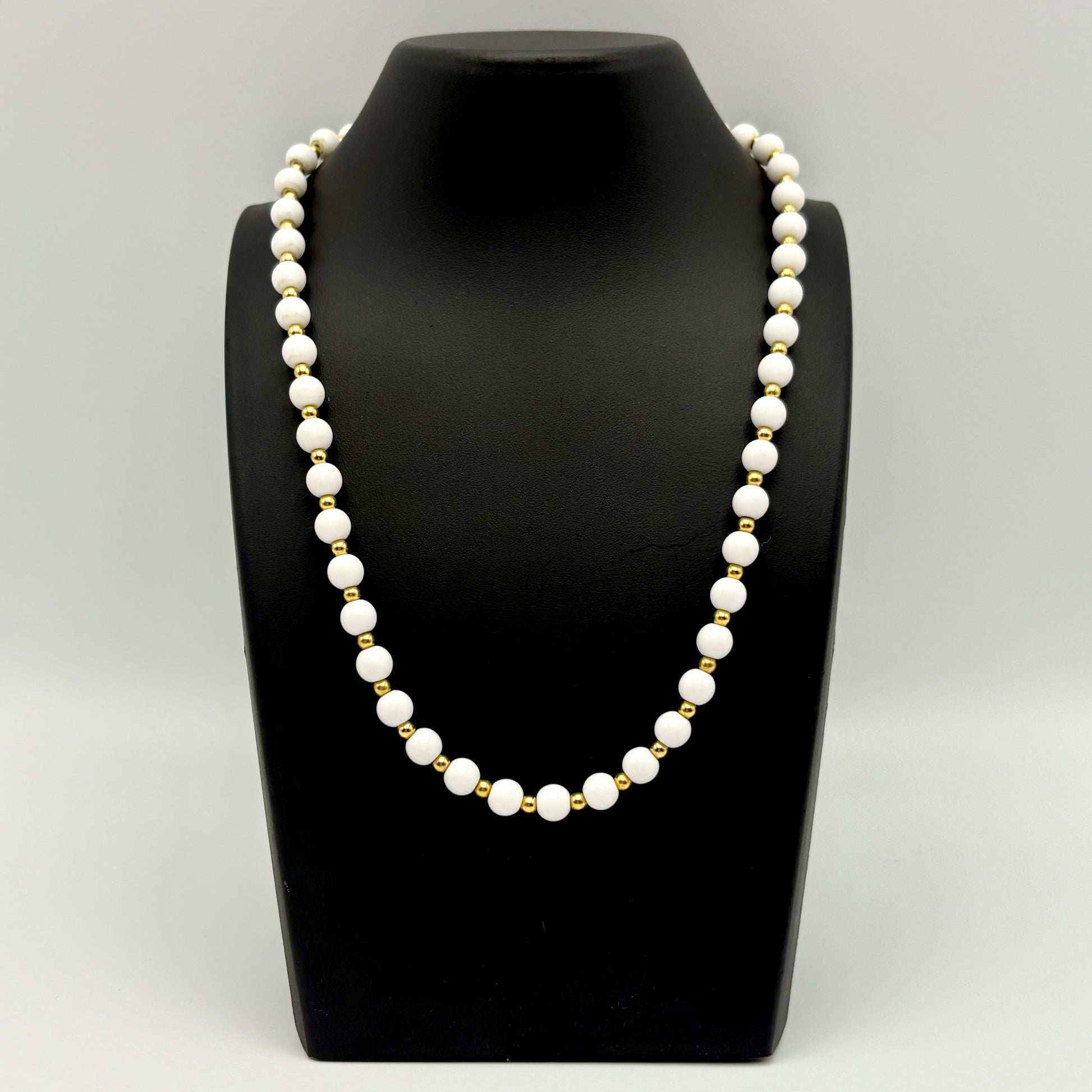 This classic necklace is a Monet design. The necklace is a single strand of polished white beads, each separated by a small, round, gold-tone spacer beads. The beads are strung on a gold-tone chain. The necklace closes with the Monet patented sister clasp that is signed MONET© on one side and PATENTED on the other side. It is also signed ©MONET on a rectangular hang tag. The necklace measures approximately 15¼” and is in excellent vintage condition.