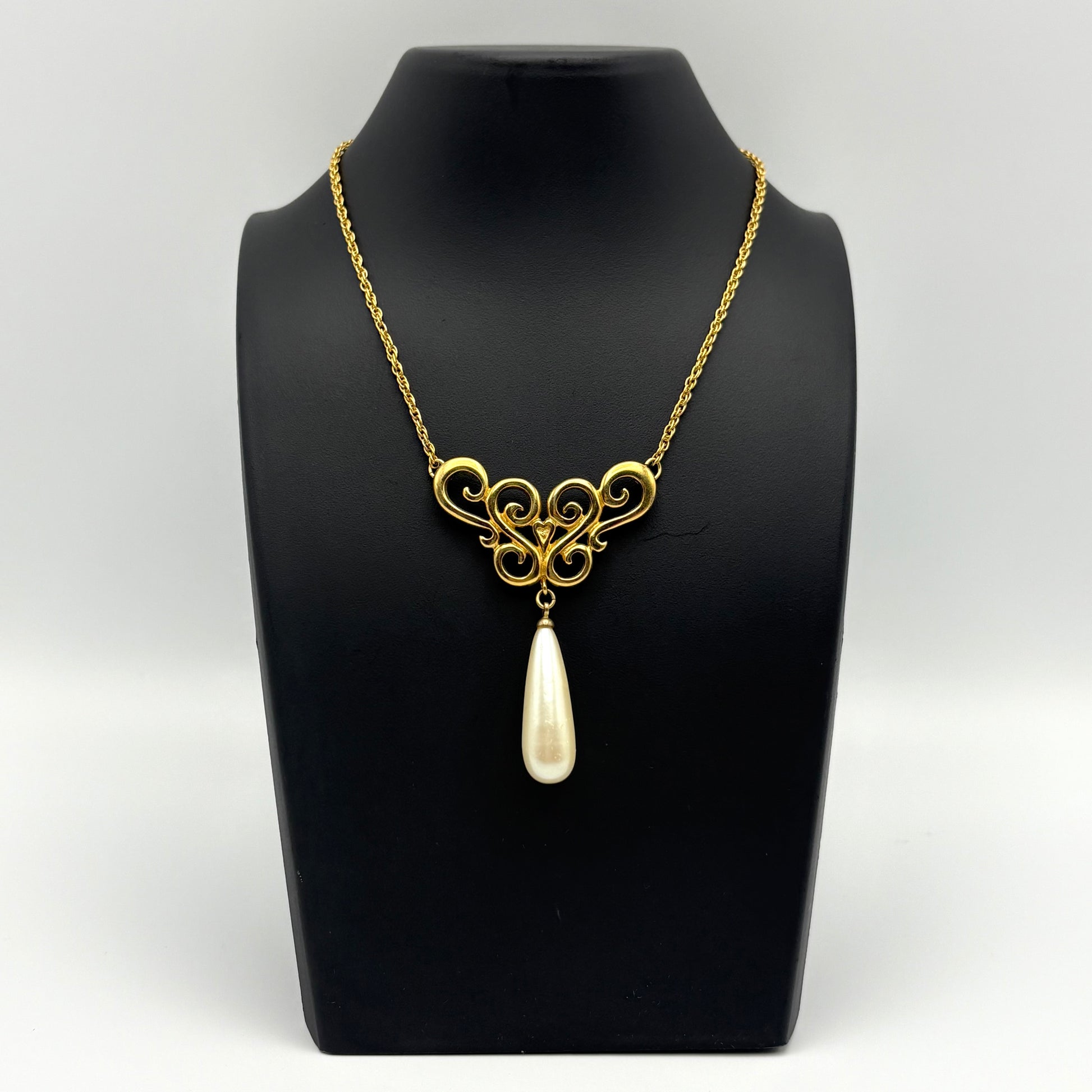 This gorgeous necklace is a Monet design. The necklace features a graceful, gold-tone, open work piece that holds a lustrous elongated faux pearl. It is set in the center of a delicate gold chain that measures approximately 15½”. It closes with Monet’s patented sister clasp. The clasp is marked MONET on one side and PATENTED on the other. The necklace is in excellent vintage condition.*