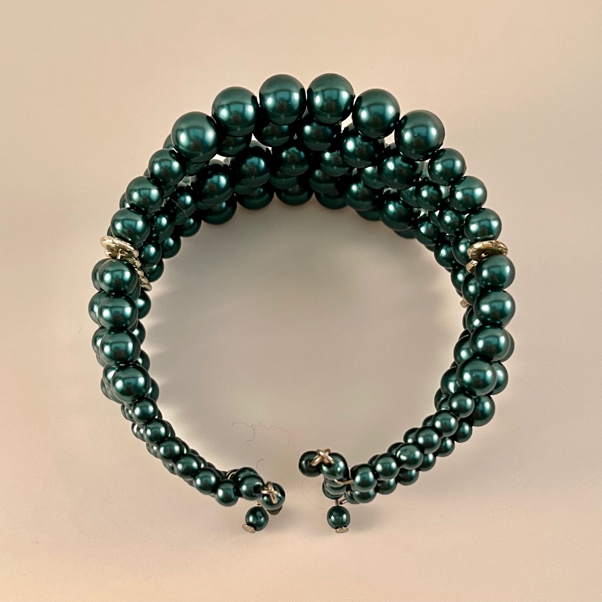 This is a pretty dark teal bead cuff bracelet. The bracelet features 5 rows of graduated beads threaded on wire. Two metal spacers hold the bracelet’s shape. There are 2 dangling beads at each end of the bracelet. The interior diameter is 2¼” and should fit a small to medium wrist. The cuff measures approximately 1½” high at the center point. The cuff bracelet is unsigned and is in excellent vintage condition.