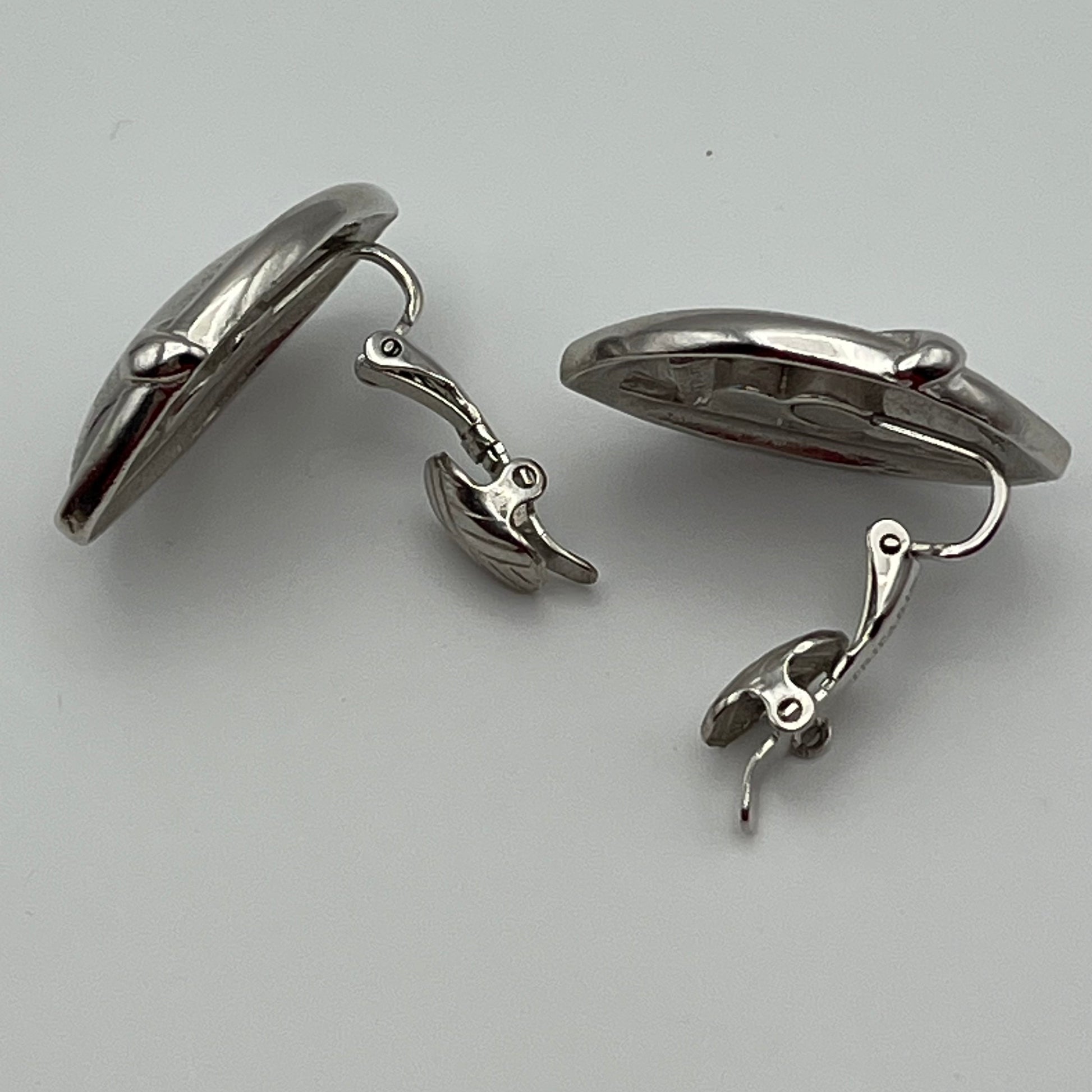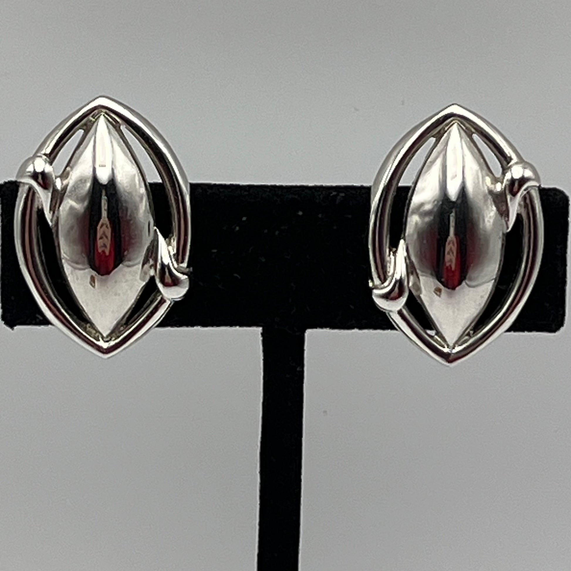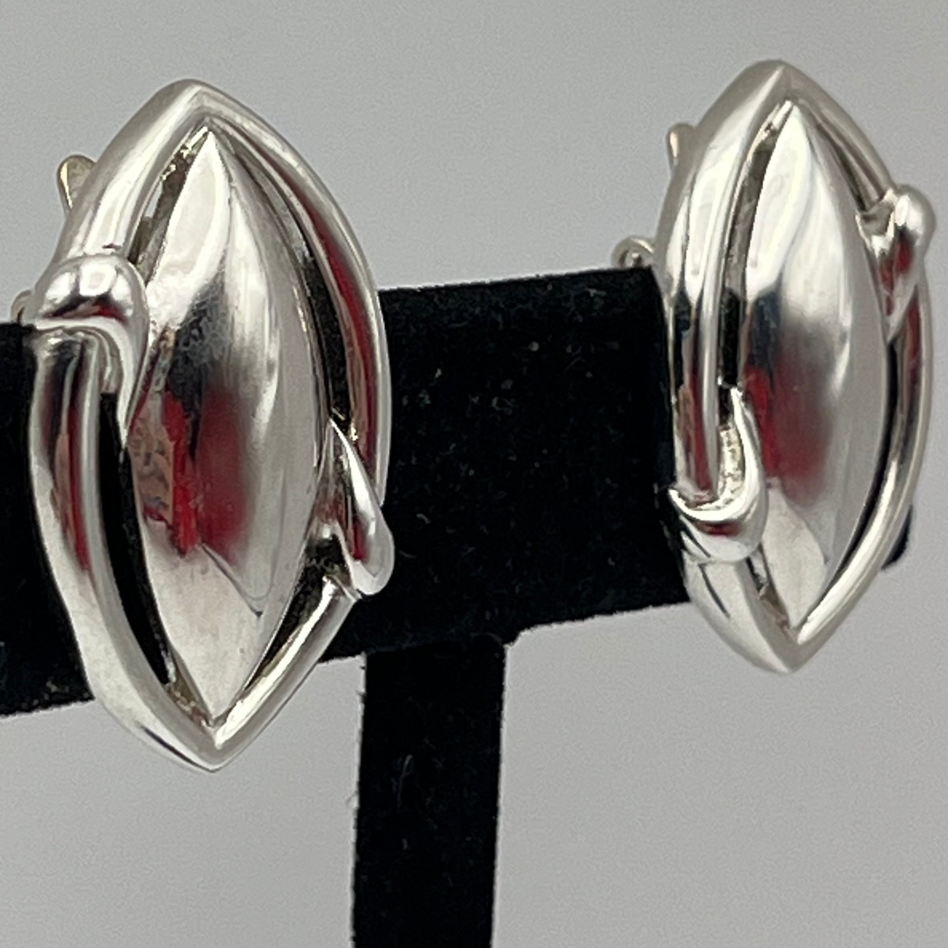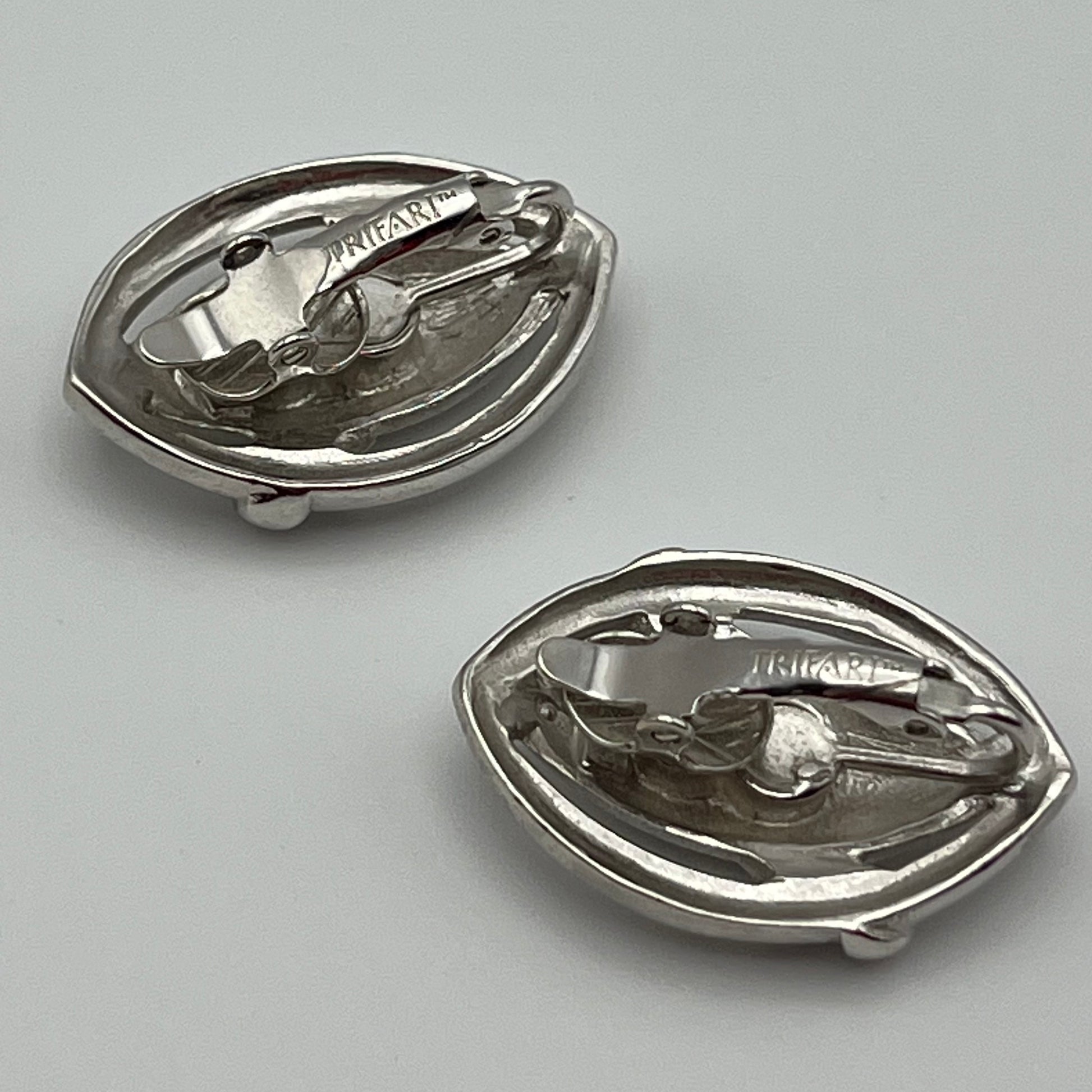 These unique clip-on earrings are by Trifari. The earrings feature an open-work, polished silver-tone leaf framing a smaller silver-tone leaf shape. There are two small leaves that overlap the frame. The earrings are signed TRIFARI TM on the clips. They measure approximately 1¼” H x ¾” W and are in excellent vintage condition.