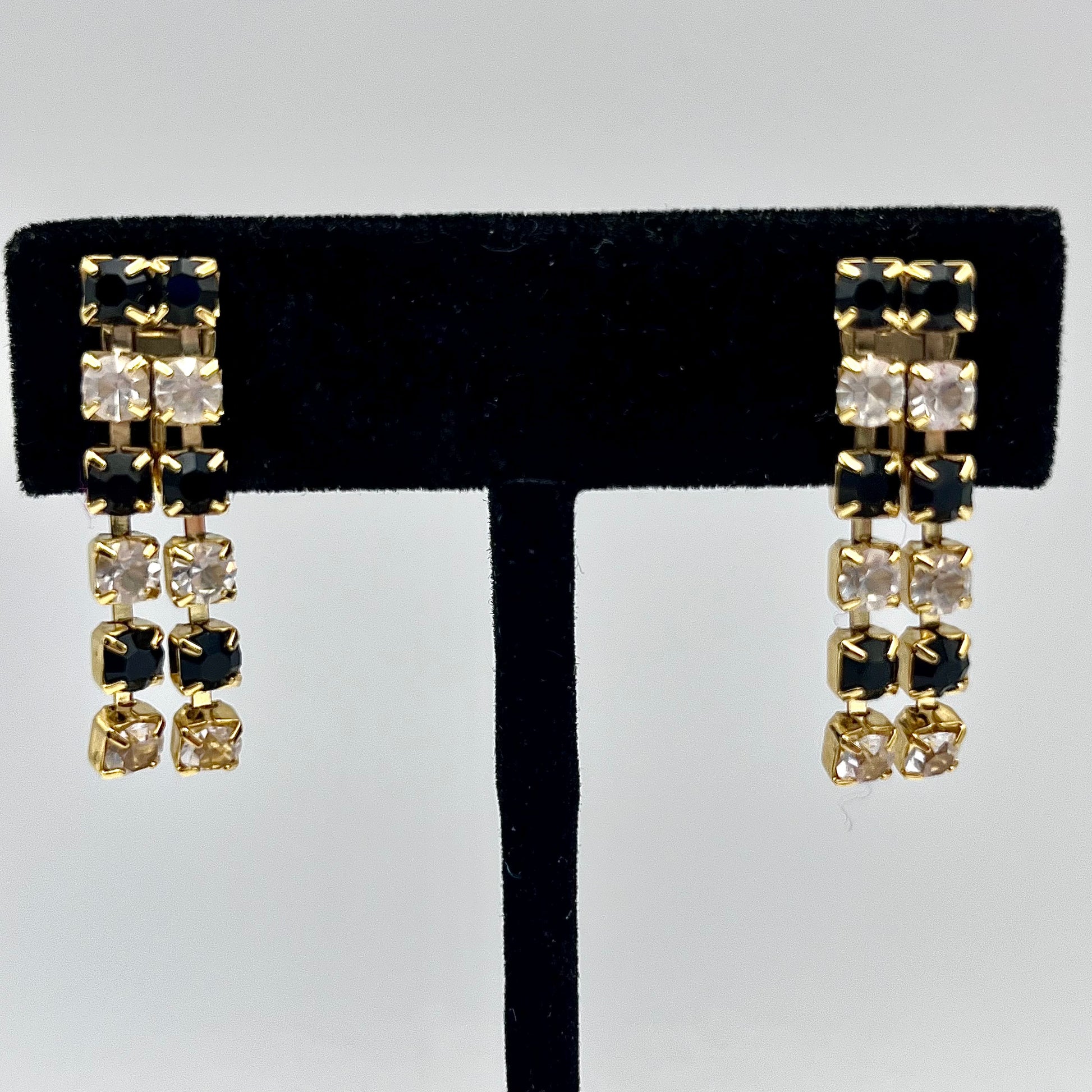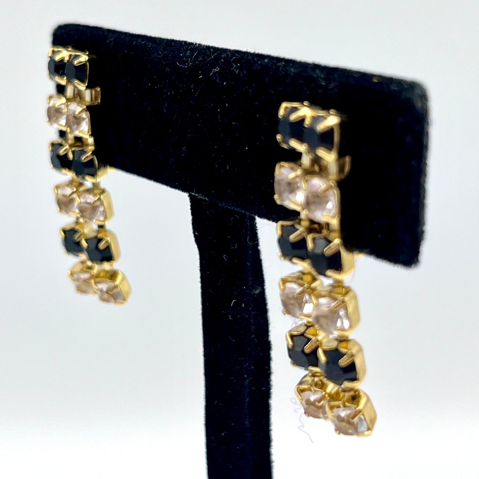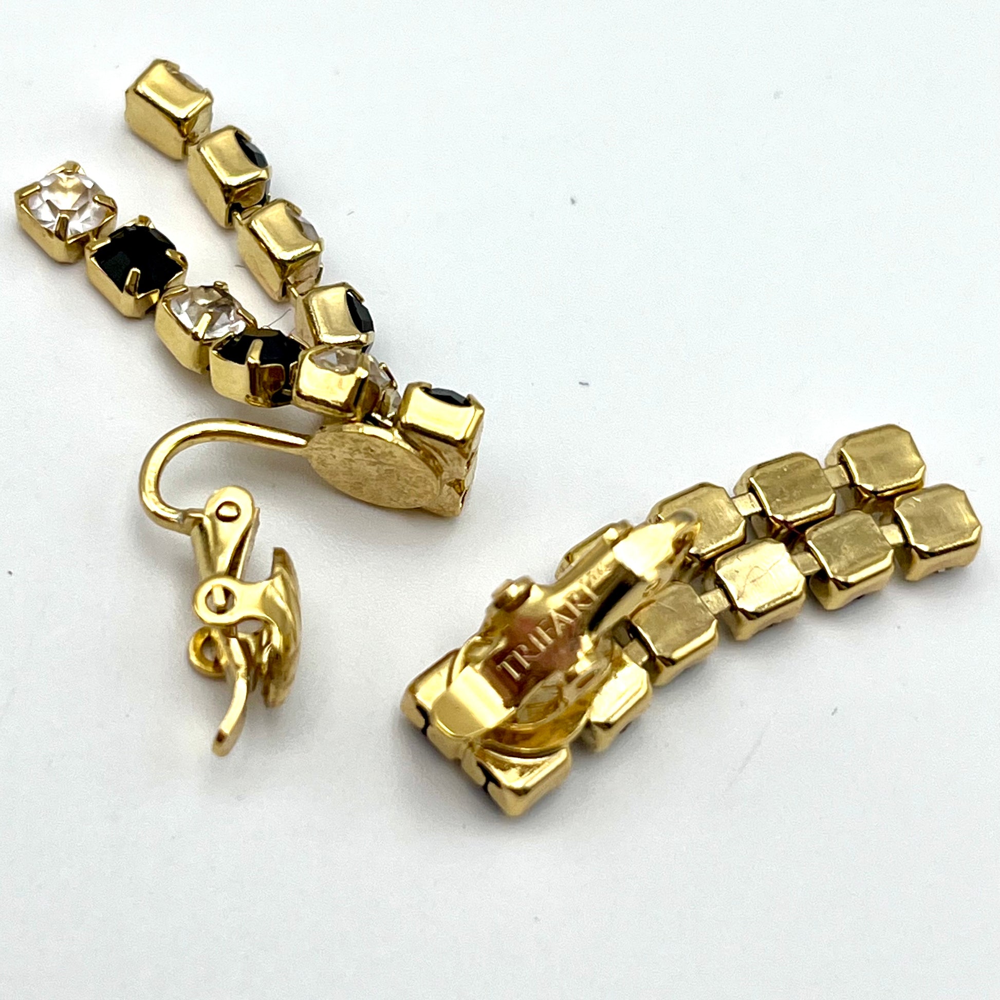 These beautiful dangle earrings are a Trifari creation. The earrings feature a double row of prong-set faceted rhinestone chains. The gold-tone chain rows alternate between black and sparkling clear rhinestones. The earrings measure approximately 1¼” H x ¼” W and close with a paddle back clip. The clips are signed TRIFARI TM. These earrings are in excellent vintage condition.