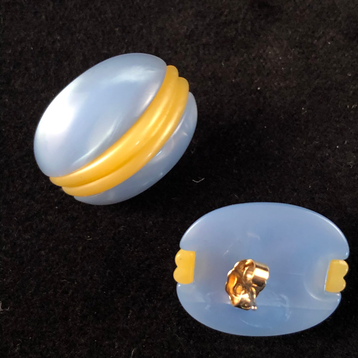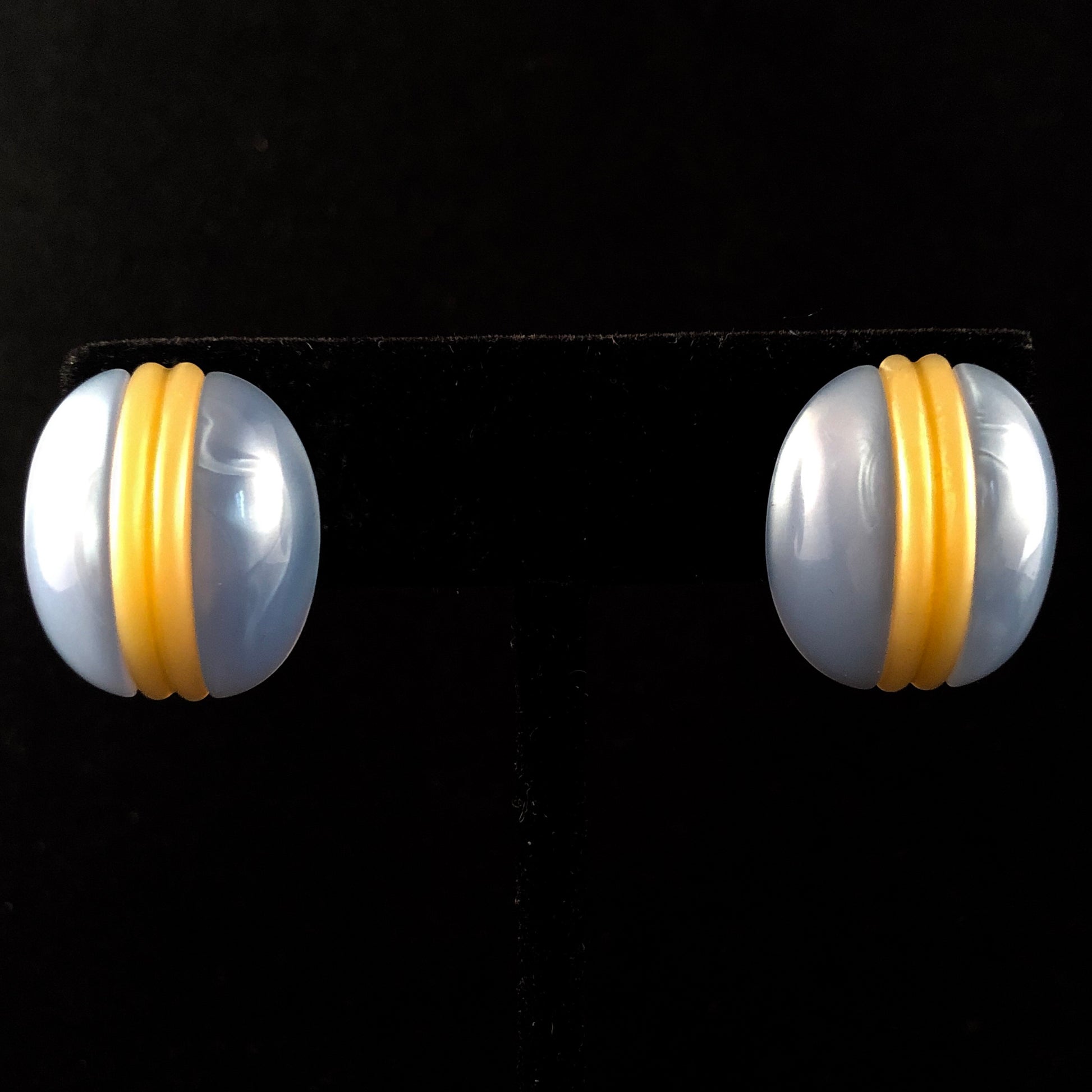 The Avon French Countryside line was introduced in 1989. The earrings from this line are made of pastel blue pearl-luster with pastel yellow stripes down the center. These pierced earrings measure ¾” x 7/8” and are in excellent vintage condition.