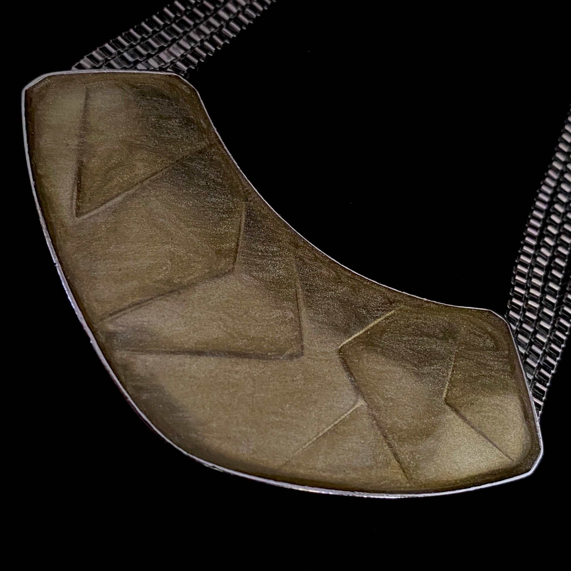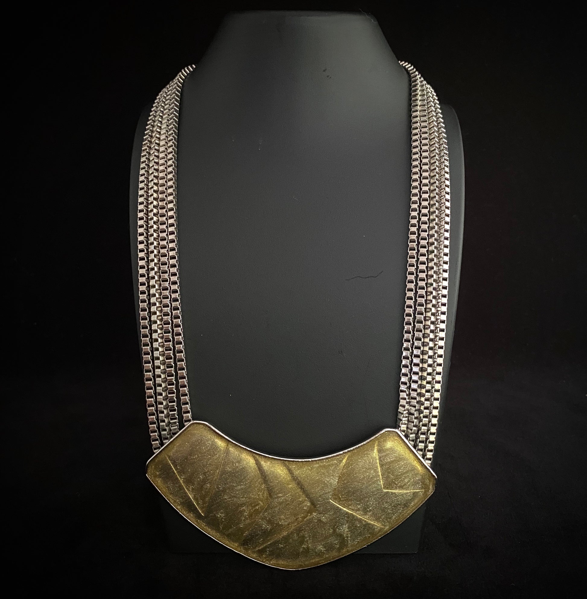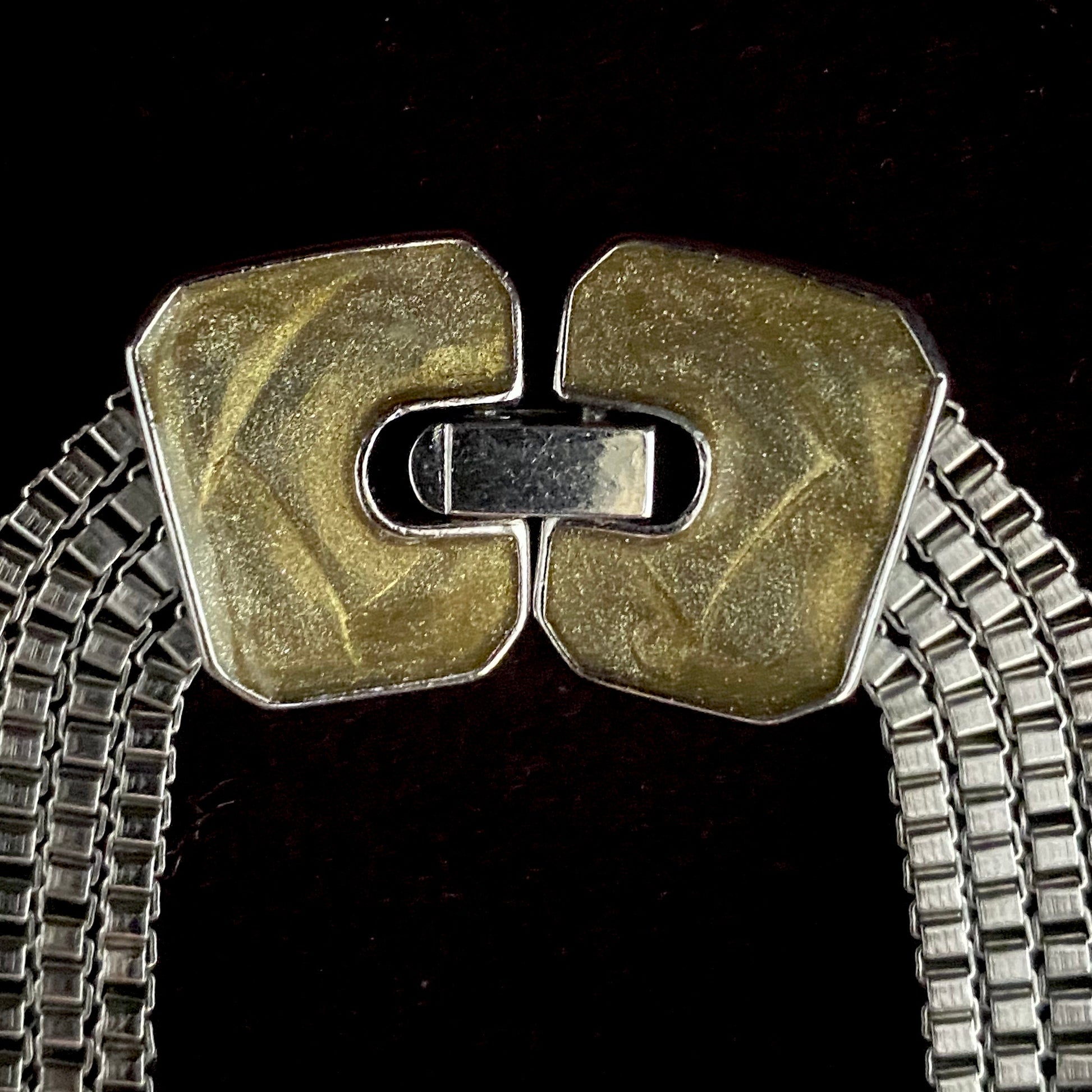 This fantastic, modernistic necklace is by Kunio Matsumoto, a Japanese architect whose designs were part of the crown Trifari lines from the late 1970’s. His designs are sought after and highly collectible. This particular necklace features an eye-catching 3½” W x 1¾” H enameled center piece. The textured center piece changes from gold to olive gold depending on the lighting. Four strands of silver-tone box chains hold the piece. It closes with a fold over clasp centered in 2 enameled pieces. The necklace measures approximately 17½” long. It is signed Crown TRIFARI© on the clasp, and TRIFARI© and Kunio Matsumoto on the center piece. This fabulous, collectible necklace is in excellent vintage condition.