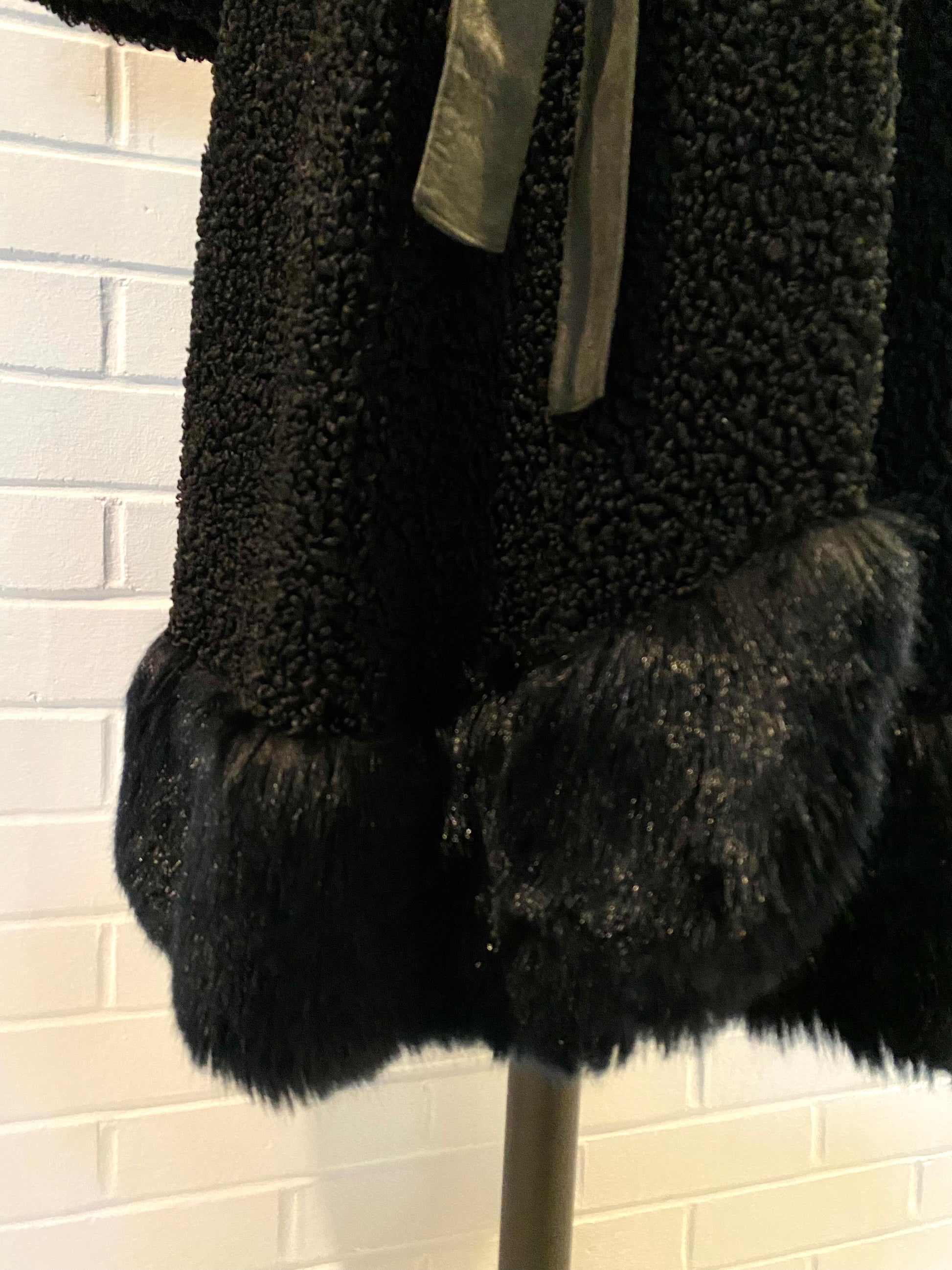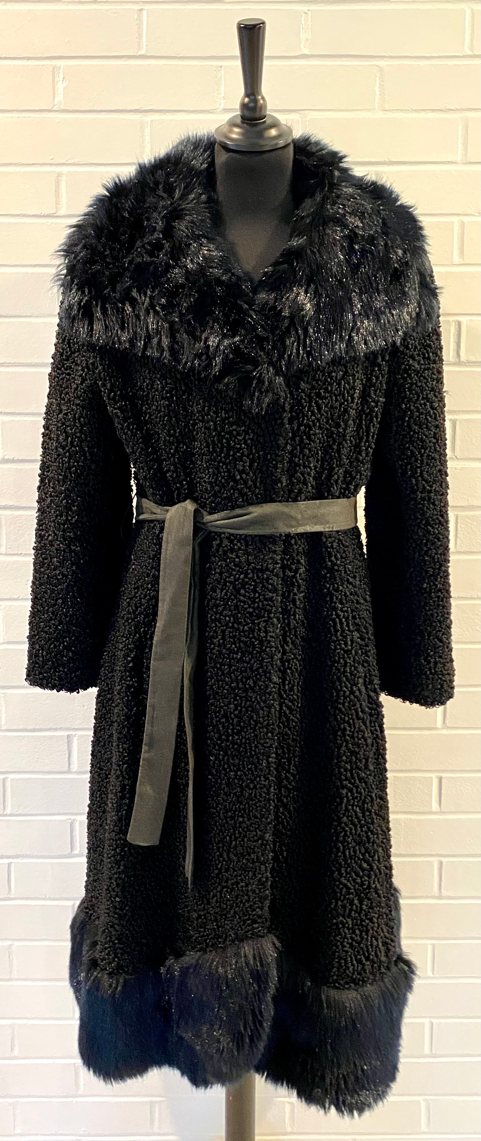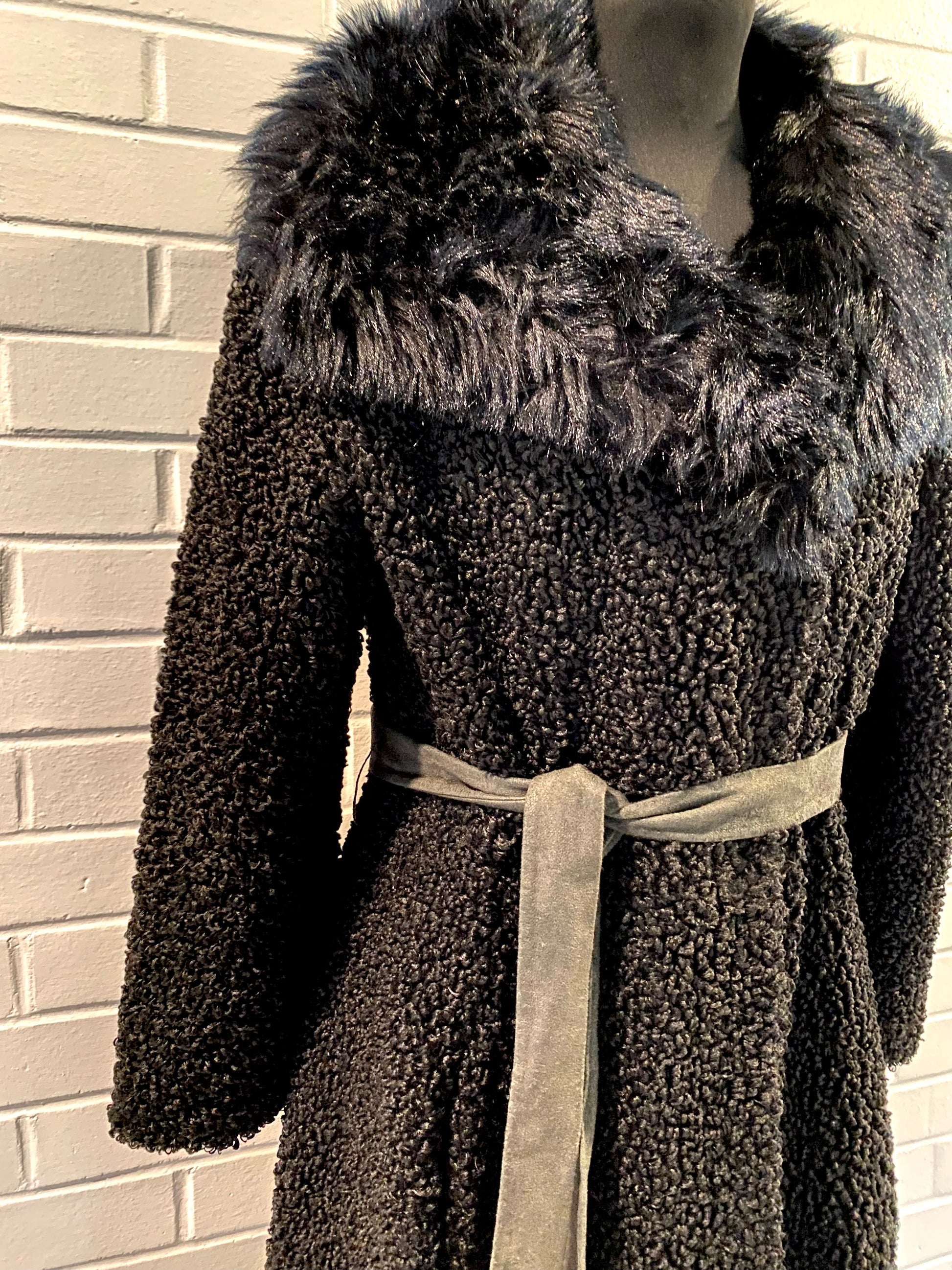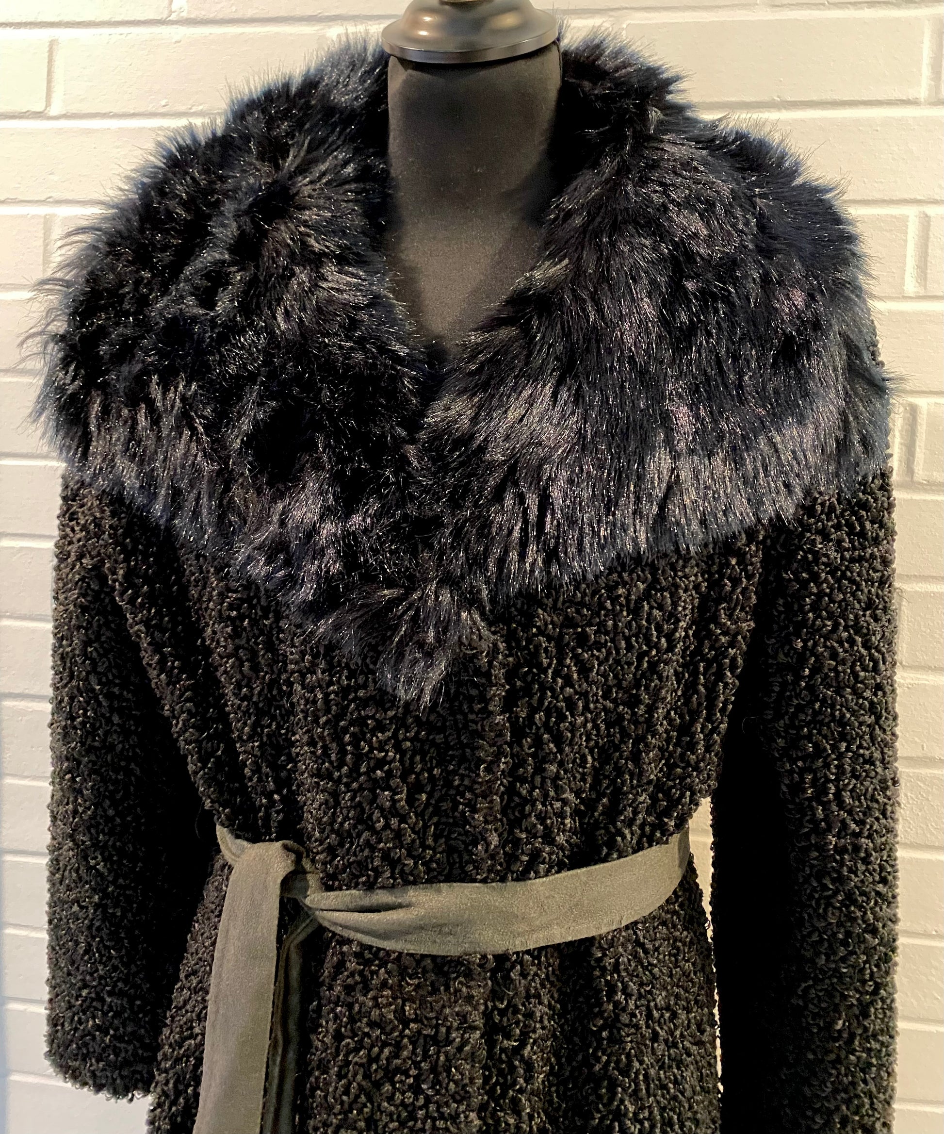 Style: This is a wrap style coat with 2 covered invisible snaps for closure at the front. There is a large shawl collar made from contrasting shag fur. The shag fur is also continued around the bottom edge of the jacket. There is a suede/leather like fabric tie belt and a thread belt loop on the side. There are 2 front pockets set into the seam. The jacket is fully lined with thick shiny taffeta lining.