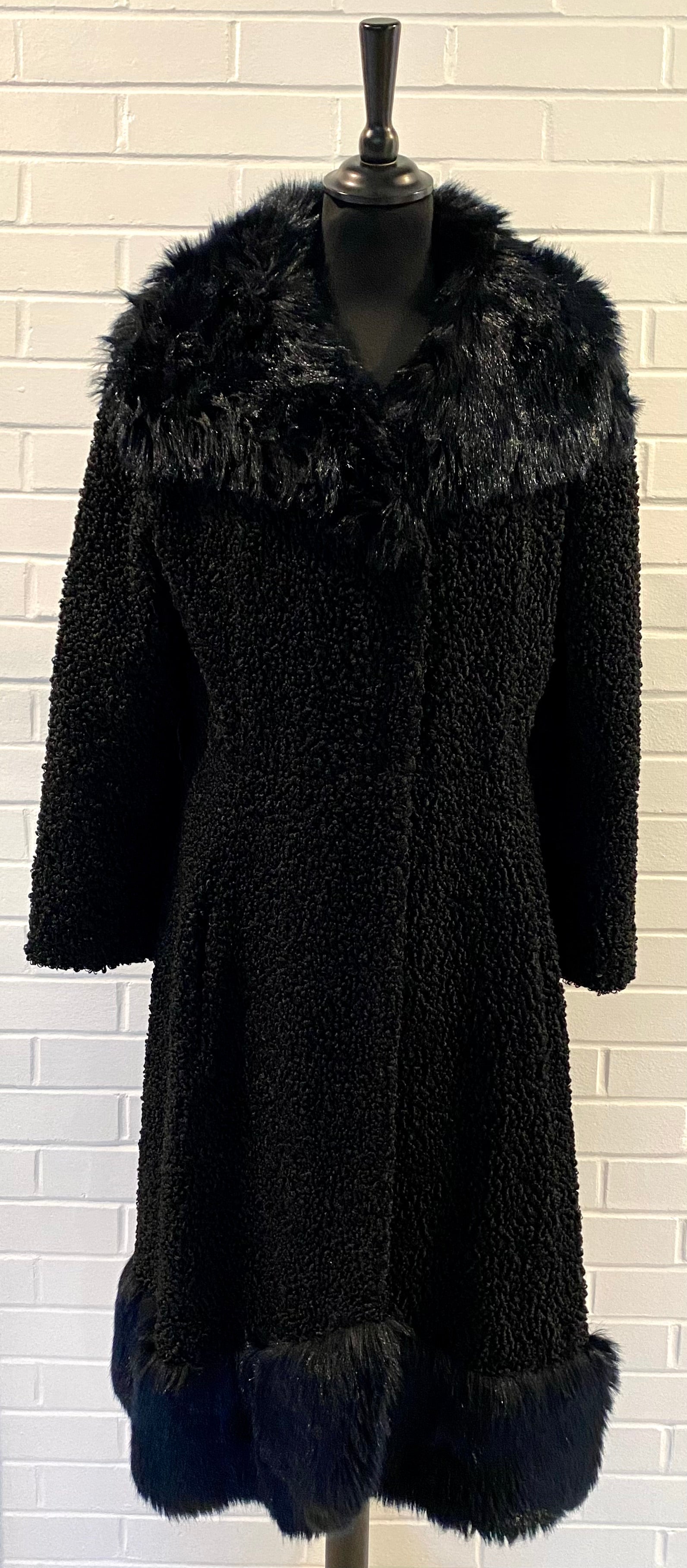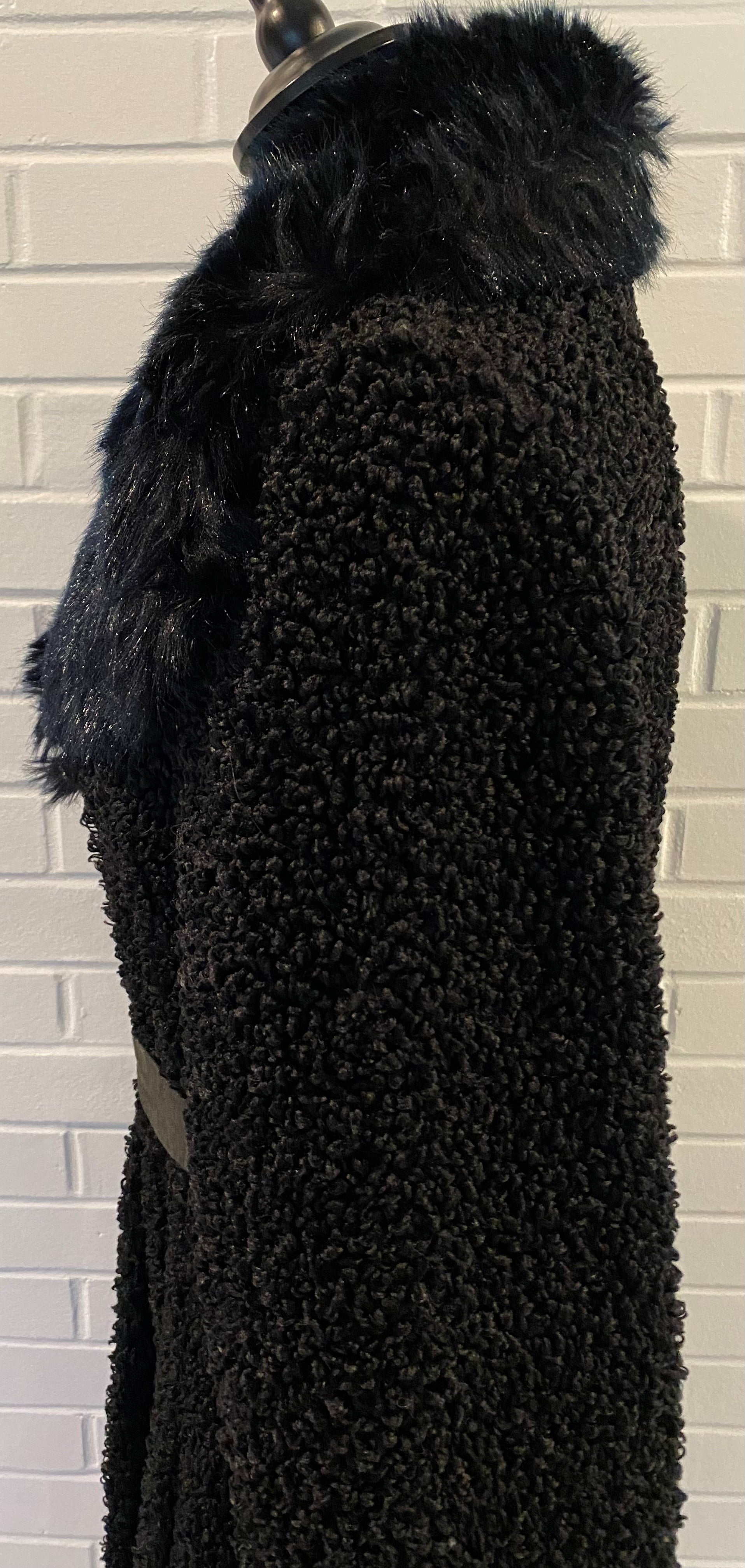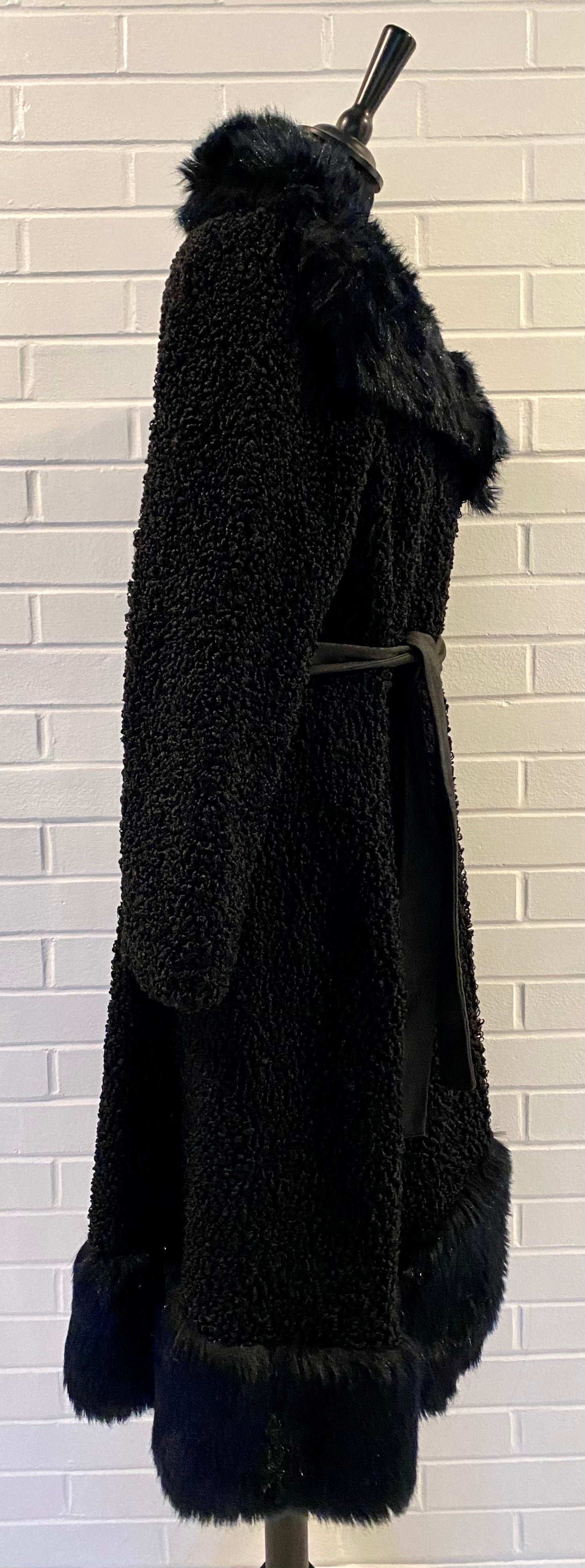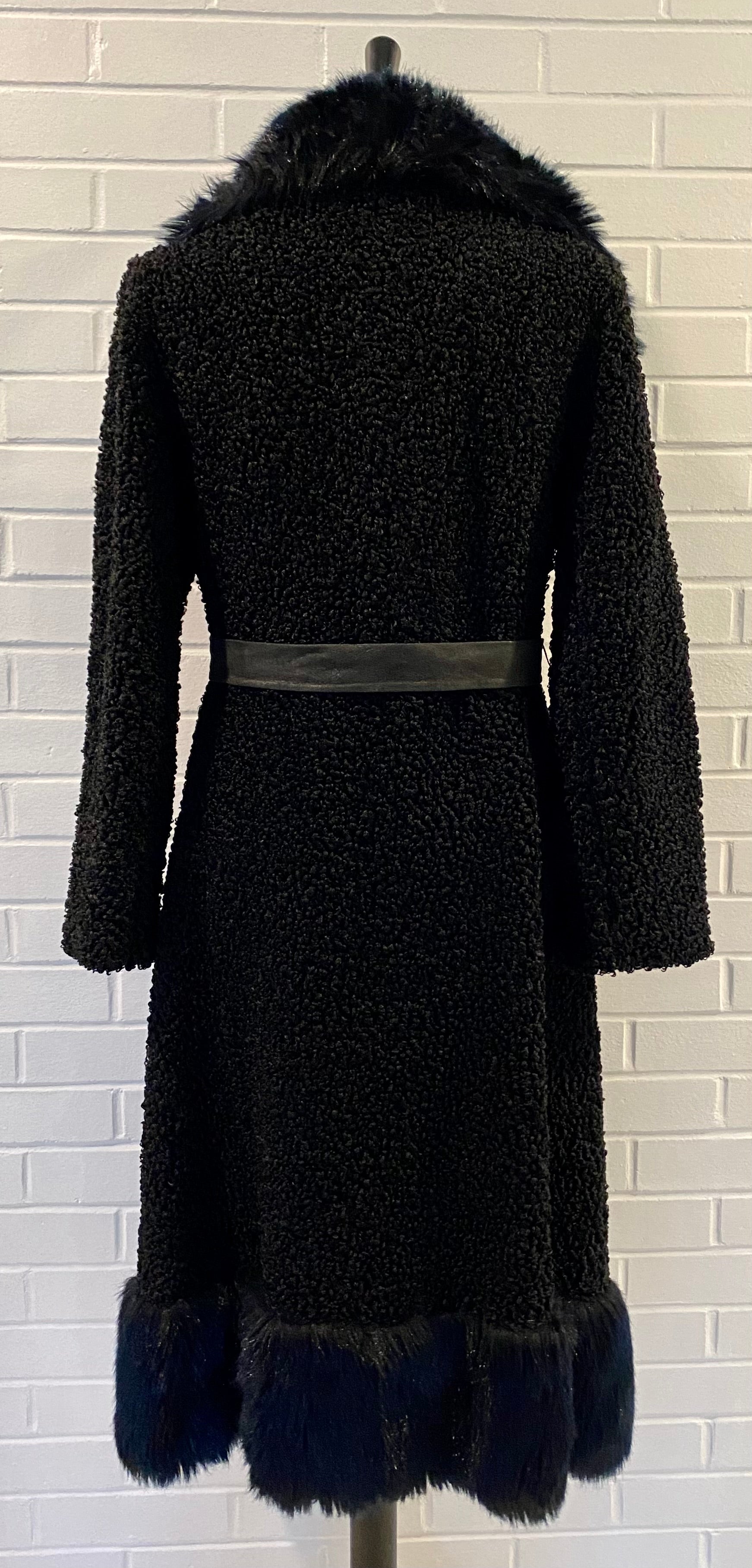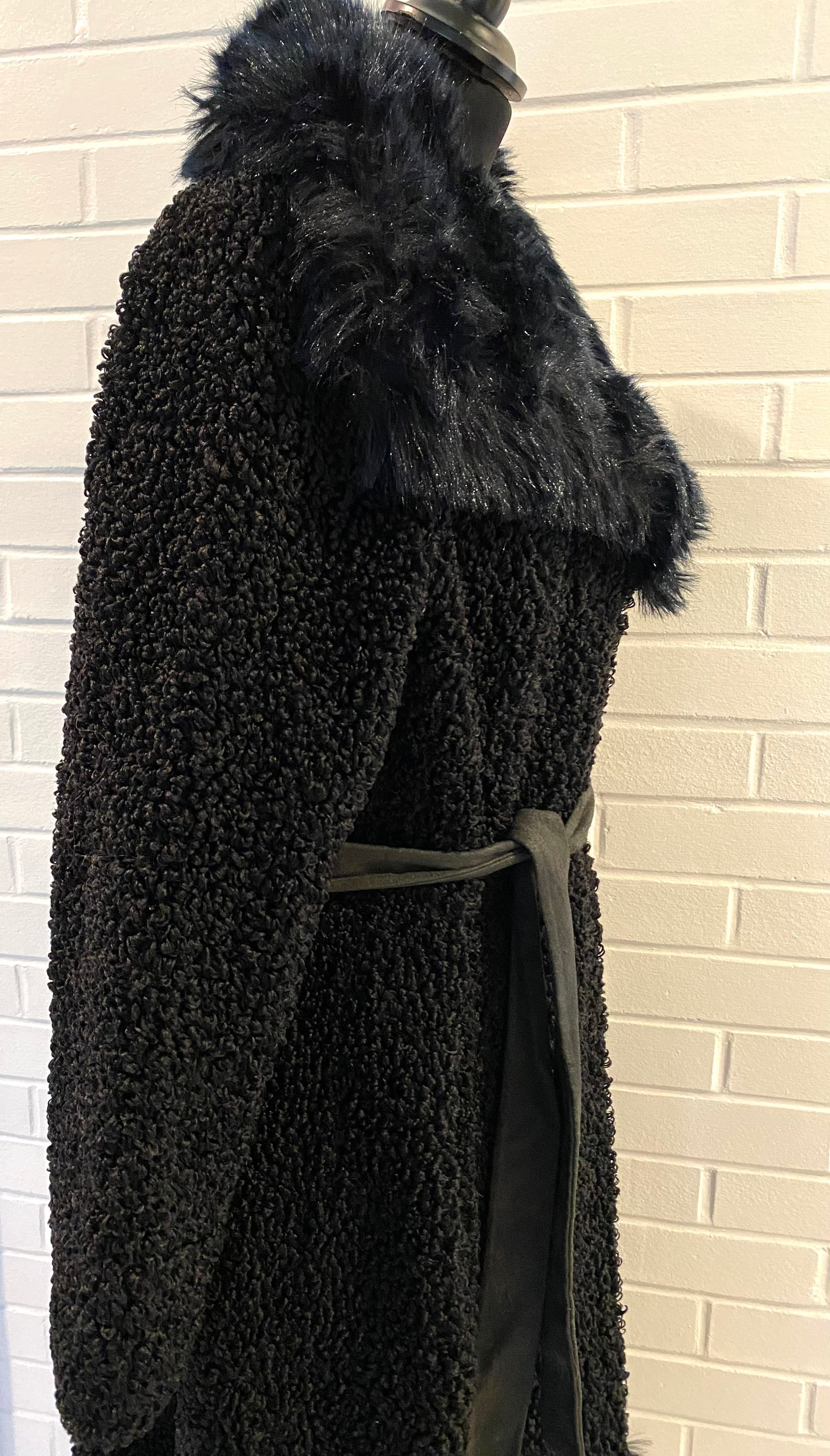 Style: This is a wrap style coat with 2 covered invisible snaps for closure at the front. There is a large shawl collar made from contrasting shag fur. The shag fur is also continued around the bottom edge of the jacket. There is a suede/leather like fabric tie belt and a thread belt loop on the side. There are 2 front pockets set into the seam. The jacket is fully lined with thick shiny taffeta lining.