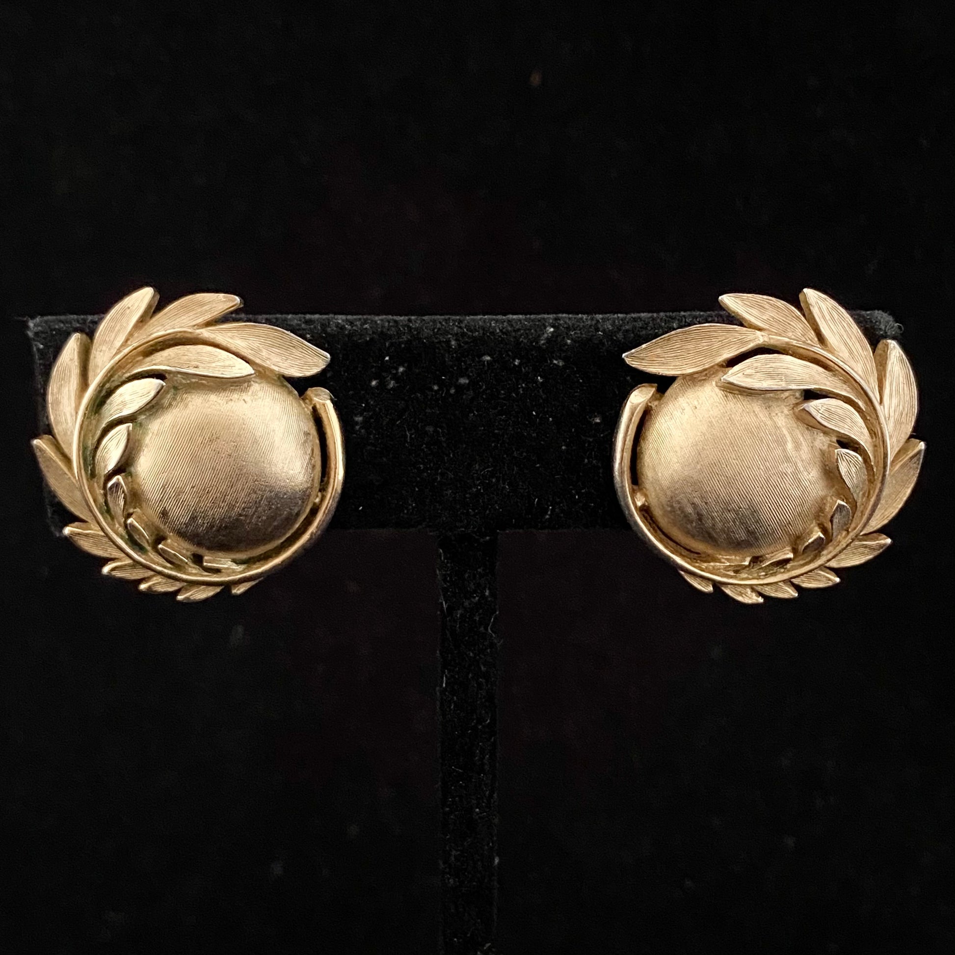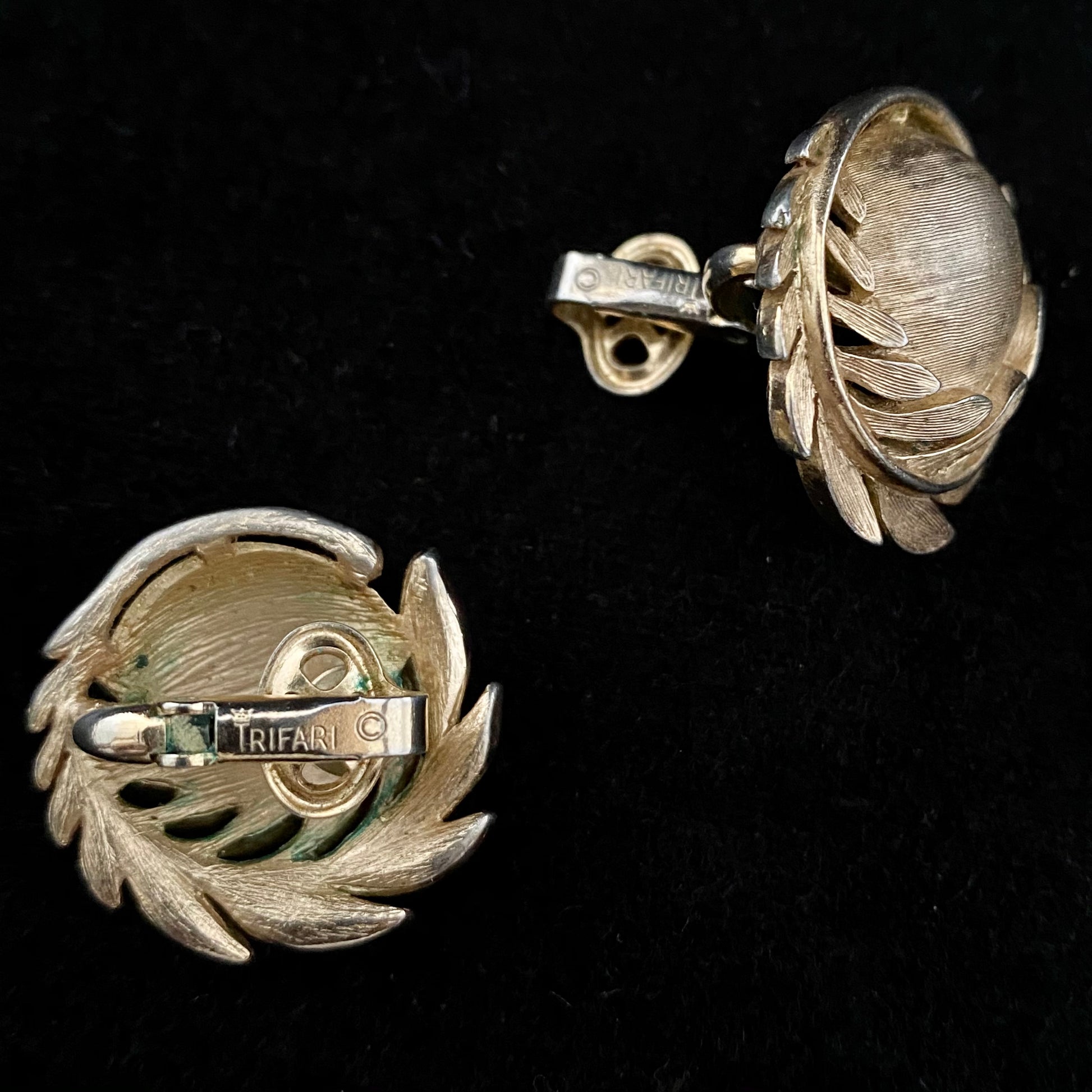These classic earrings are from Trifari. The brushed gold-tone clip on earrings feature a round, domed center surrounded by a spray of graduated leaves. The earrings are signed Crown TRIFARI© on the earring clips. They measure approximately 1” in diameter and are in very good vintage condition.*