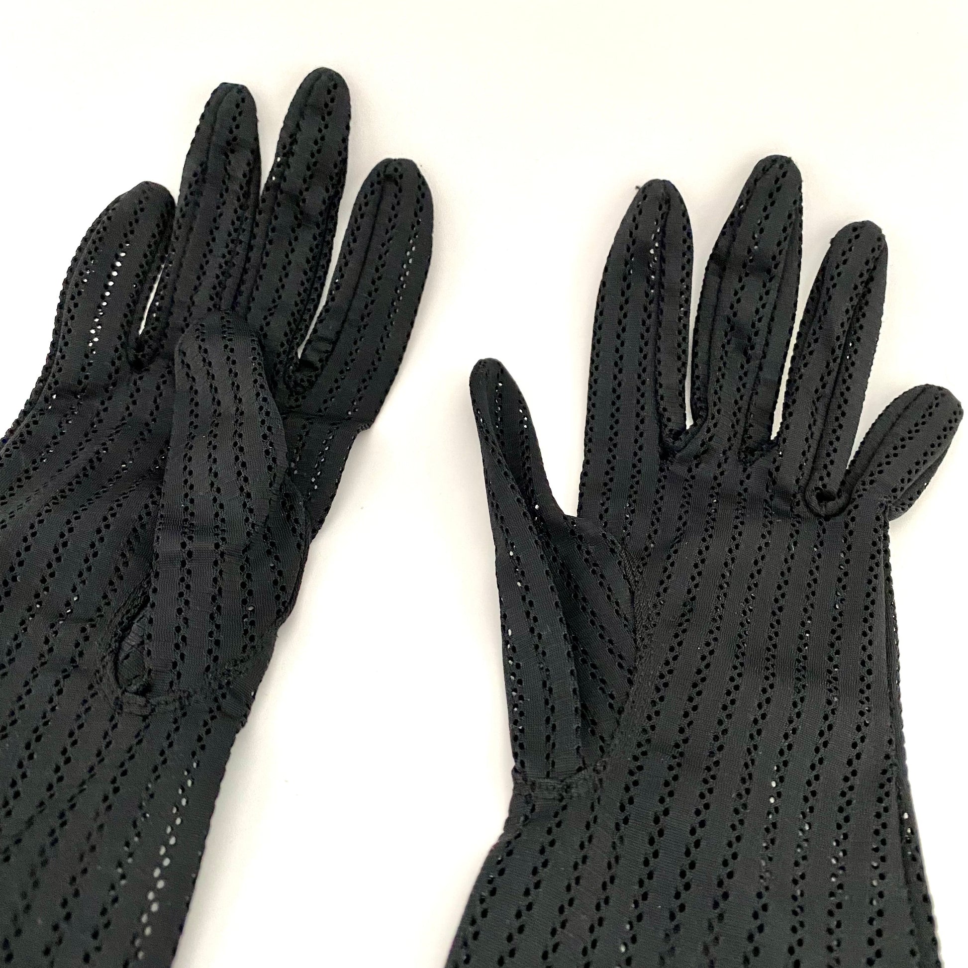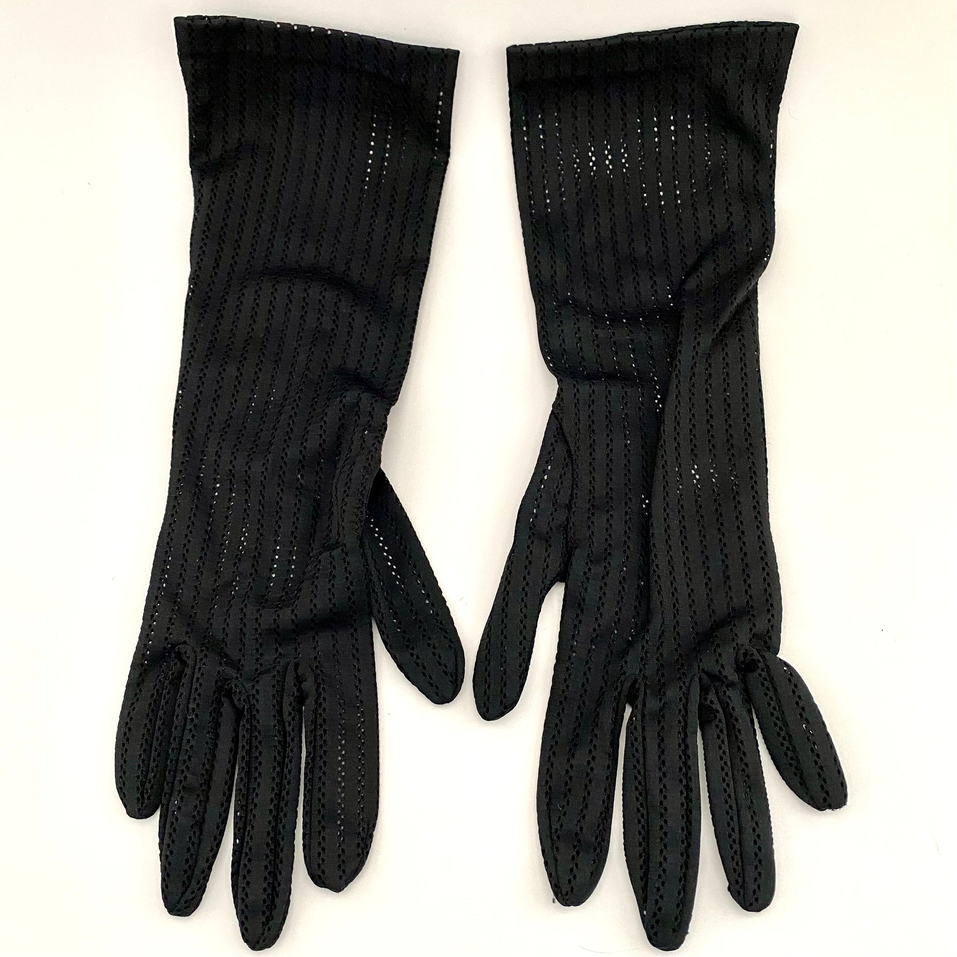 These mesh like gloves are from Touche by Fownes. Although, they may have been worn they are still with their original packaging. The size is not available but the measurements are approximately 13" in length not stretched and hand opening is 4" not stretched. The width across the palm is 3 1/2". The fabric content is not available but they are possibly are some type of nylon blend. They do have some stretch to them. They are in excellent vintage condition.