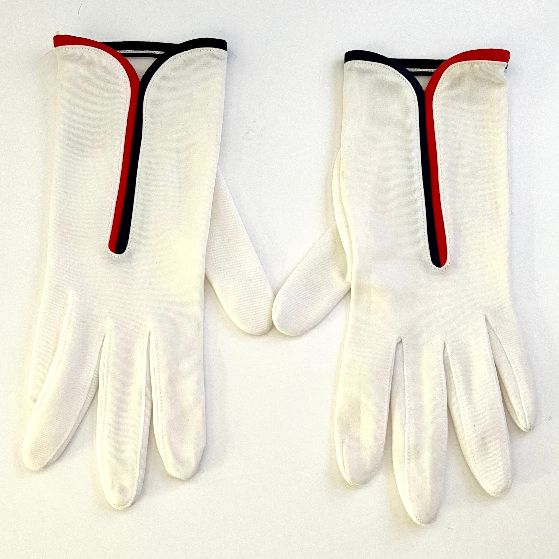 These fun, red, white and blue gloves are labeled Fownes Embraceable. They do not have much stretch because they are 100% Nylon. The size on the label is unreadable but they measure approximately 8 3/4" in length, at the hand opening is 3 3/8"and 3 1/4" across the palm. They are in excellent vintage condition.