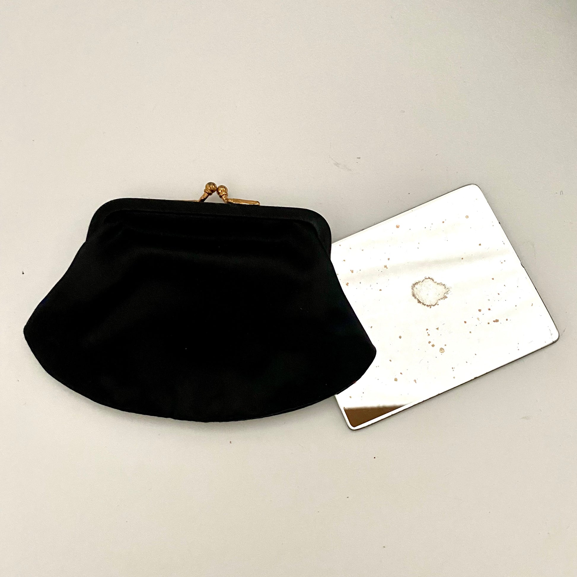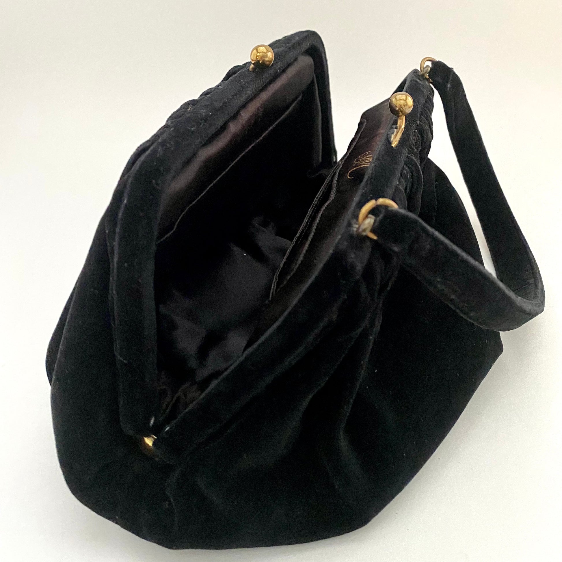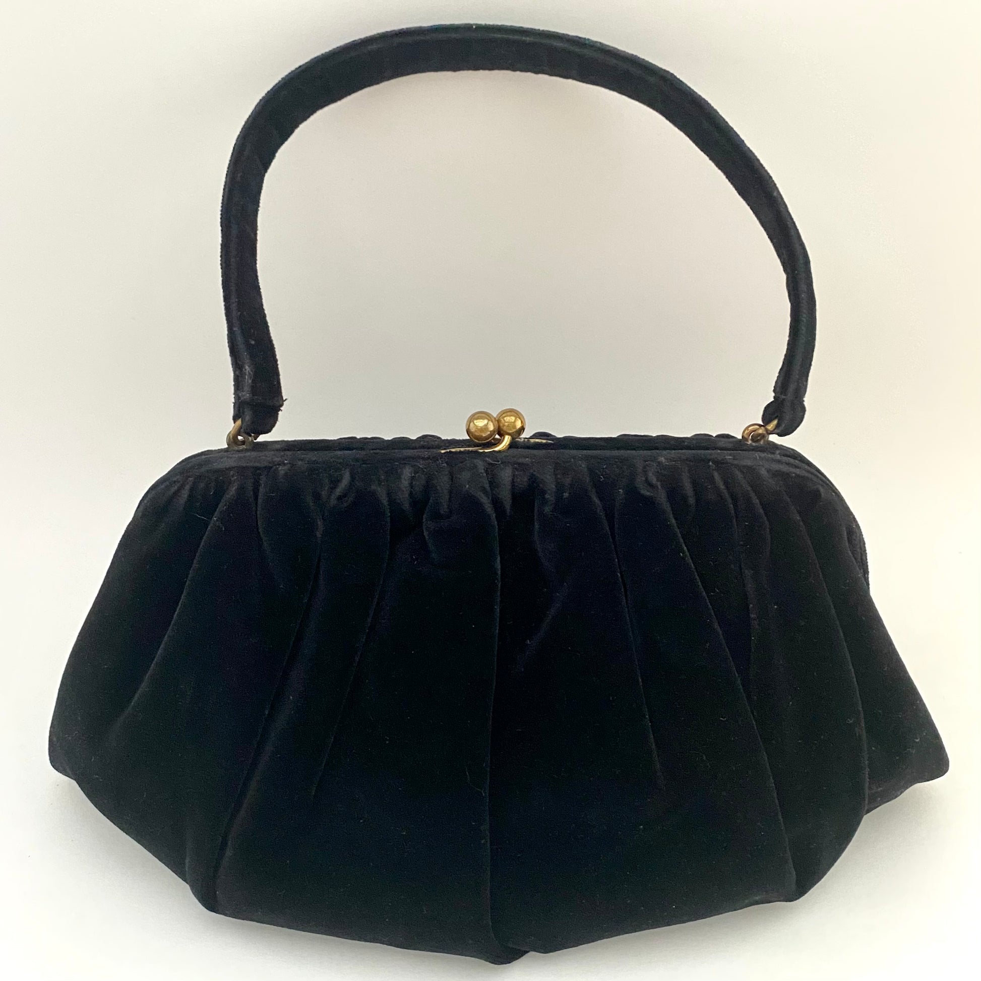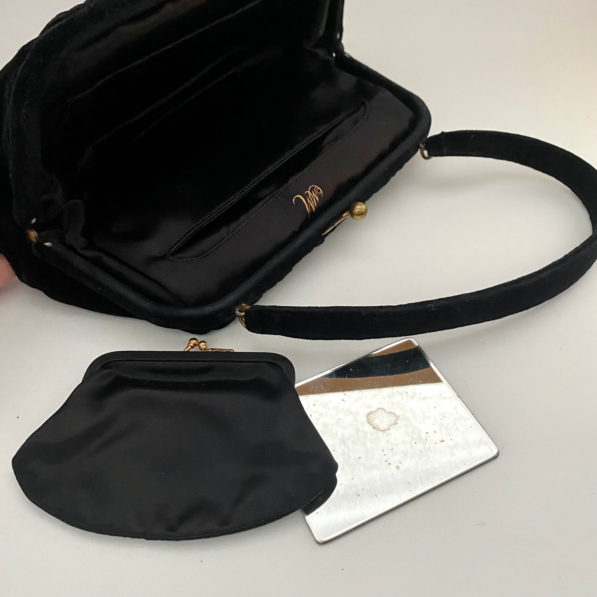 Style: A velvet fabric, rectangular frame handbag with a kiss lock closure. The handle is short and the interior has two wall pockets, there is a matching change purse and the original pocket mirror.