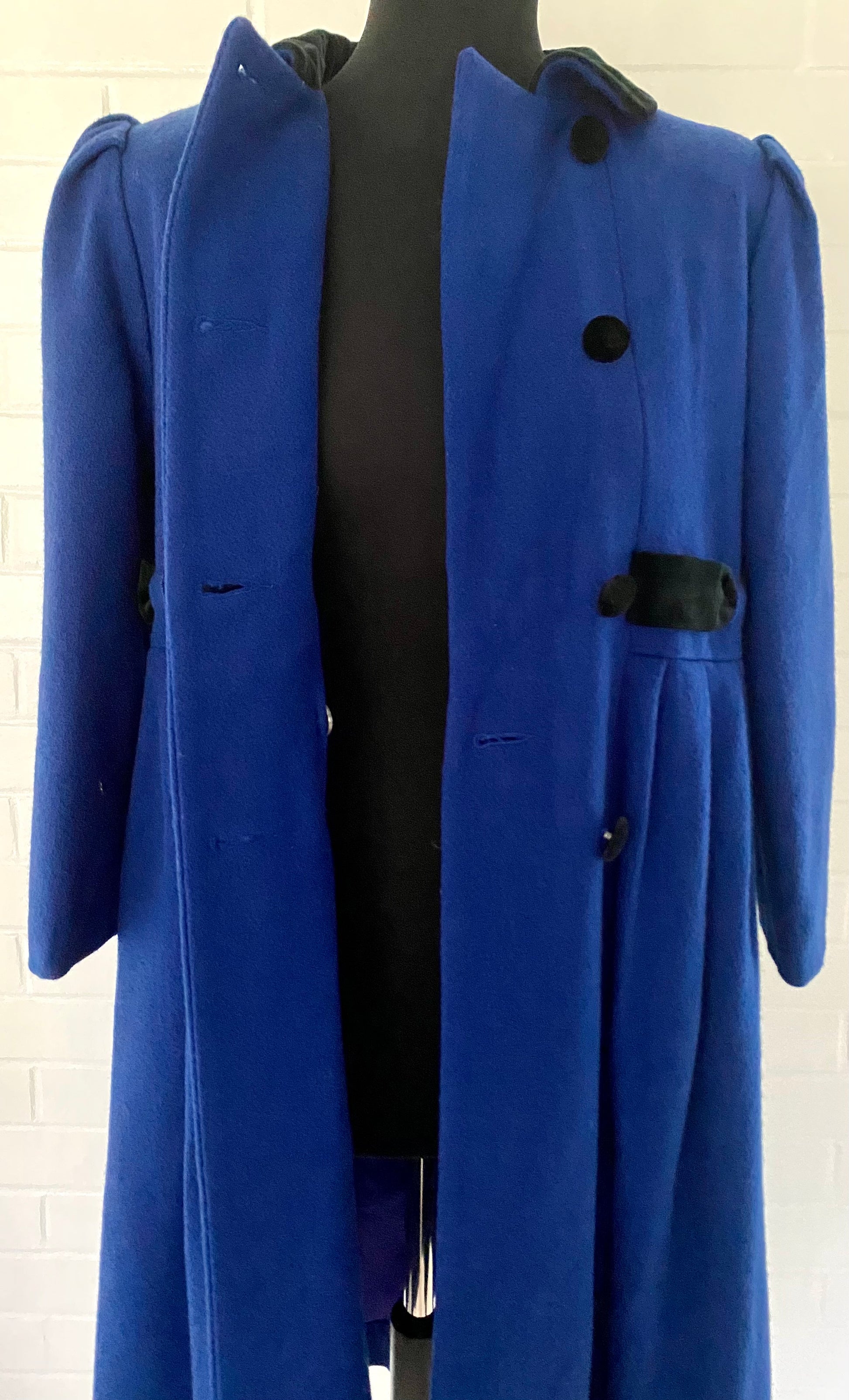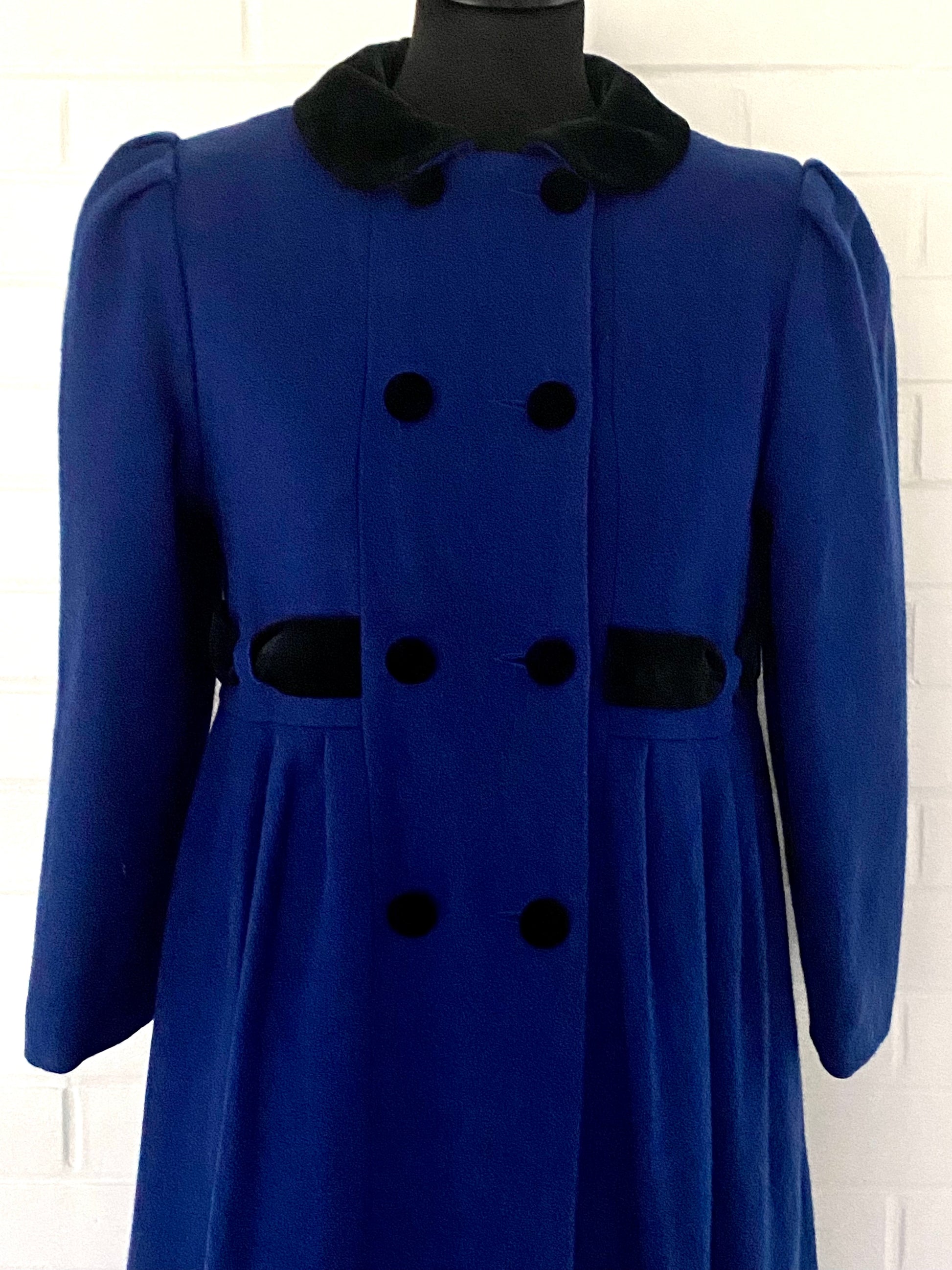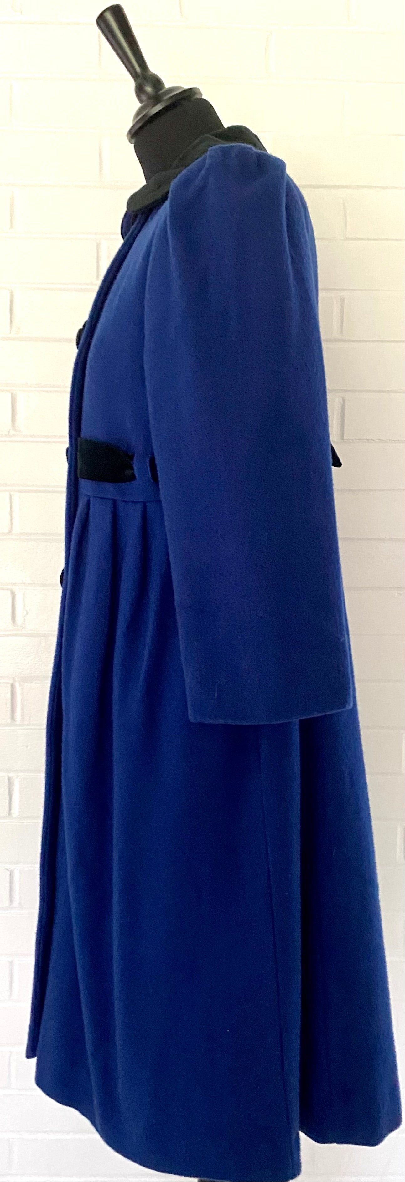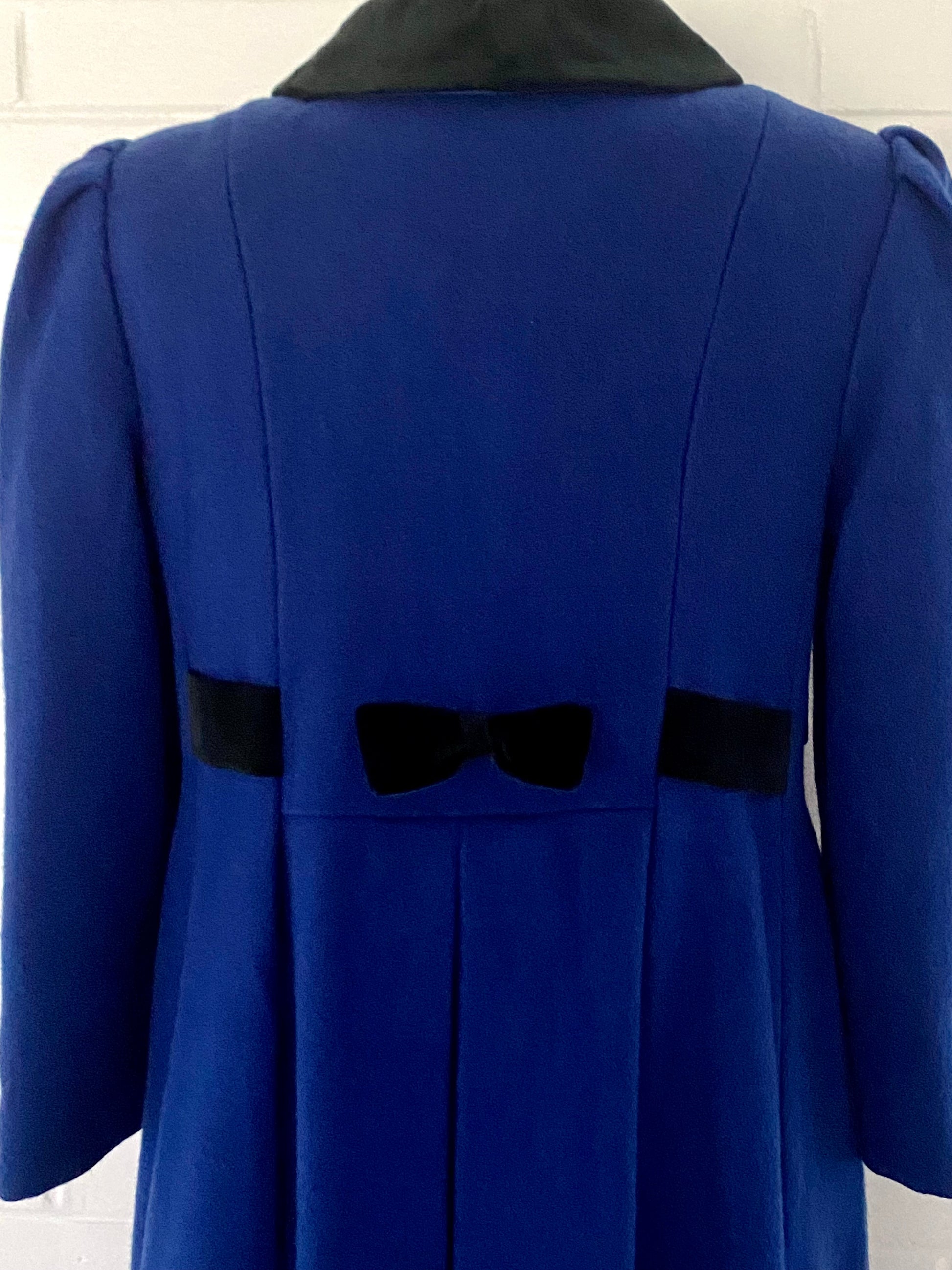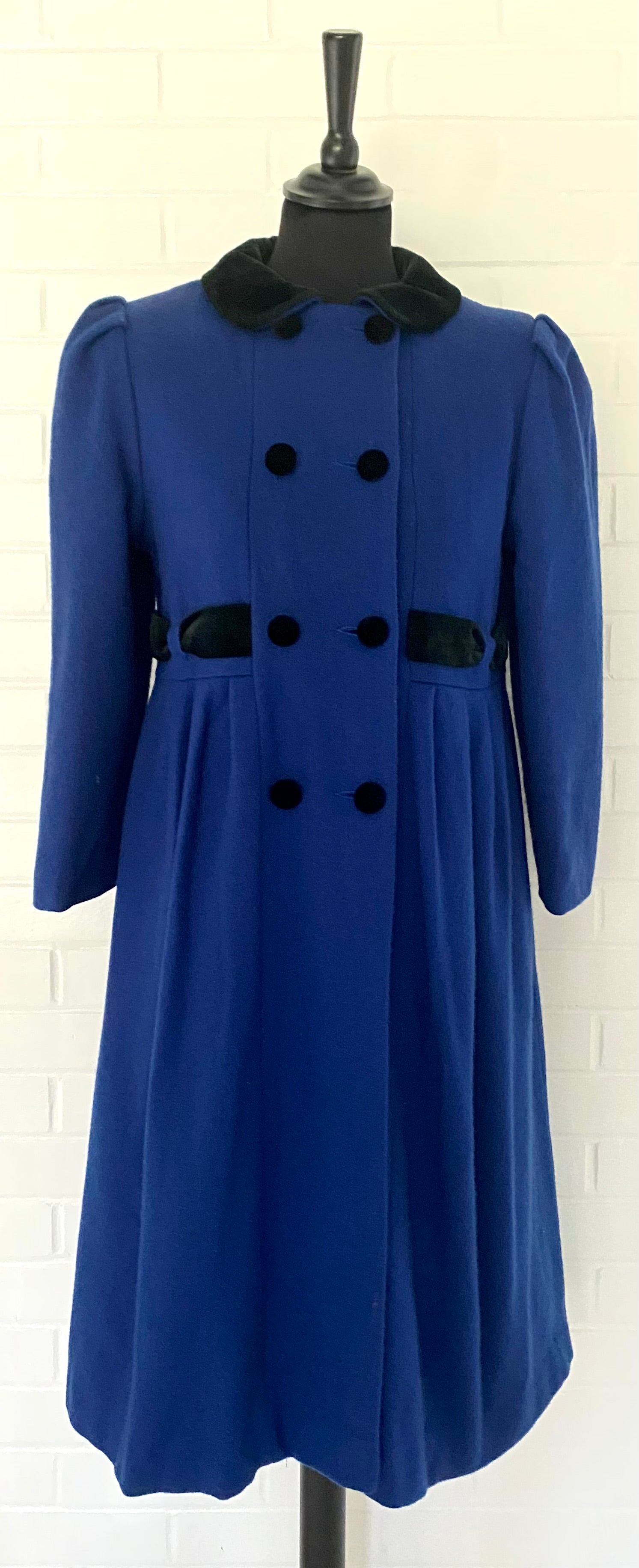 Style: This peter pan collared coat is double breasted and has bracelet length sleeves with puffs at the shoulders. The front has a seam at the waistline that has three tucks on either side of the center front. There are pockets built into the side seams. Right above this seam is built in belt that is woven through holes in the fabric and is carried onto the back. The back has princess seams and there is a bow from the belt in the center back. At the bottom, there is also a center back inverted pleat and one tuck on either side of the pleat. The coat is fully lined and the lining is insulated with another fabric.