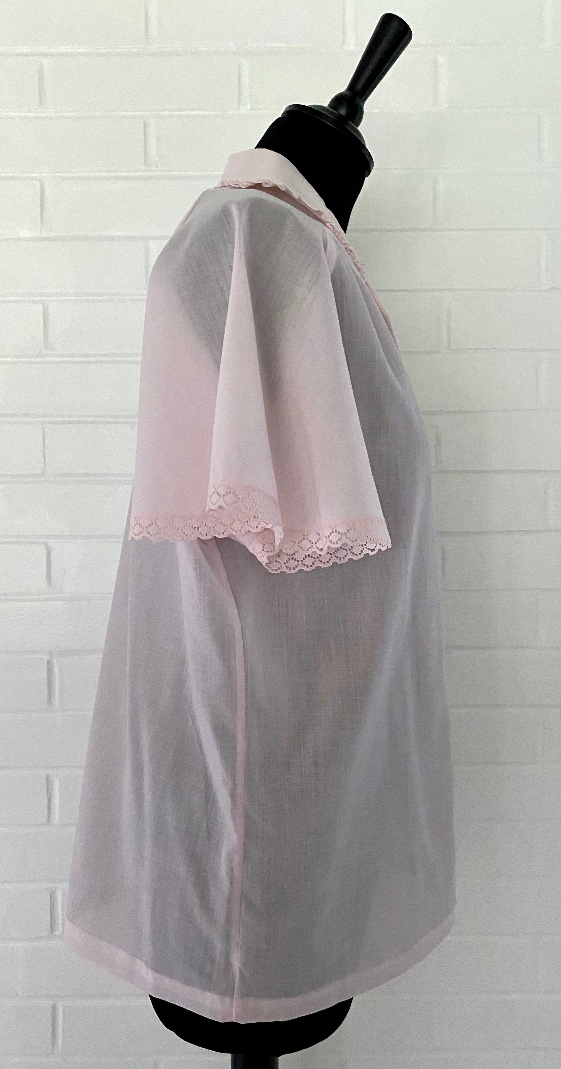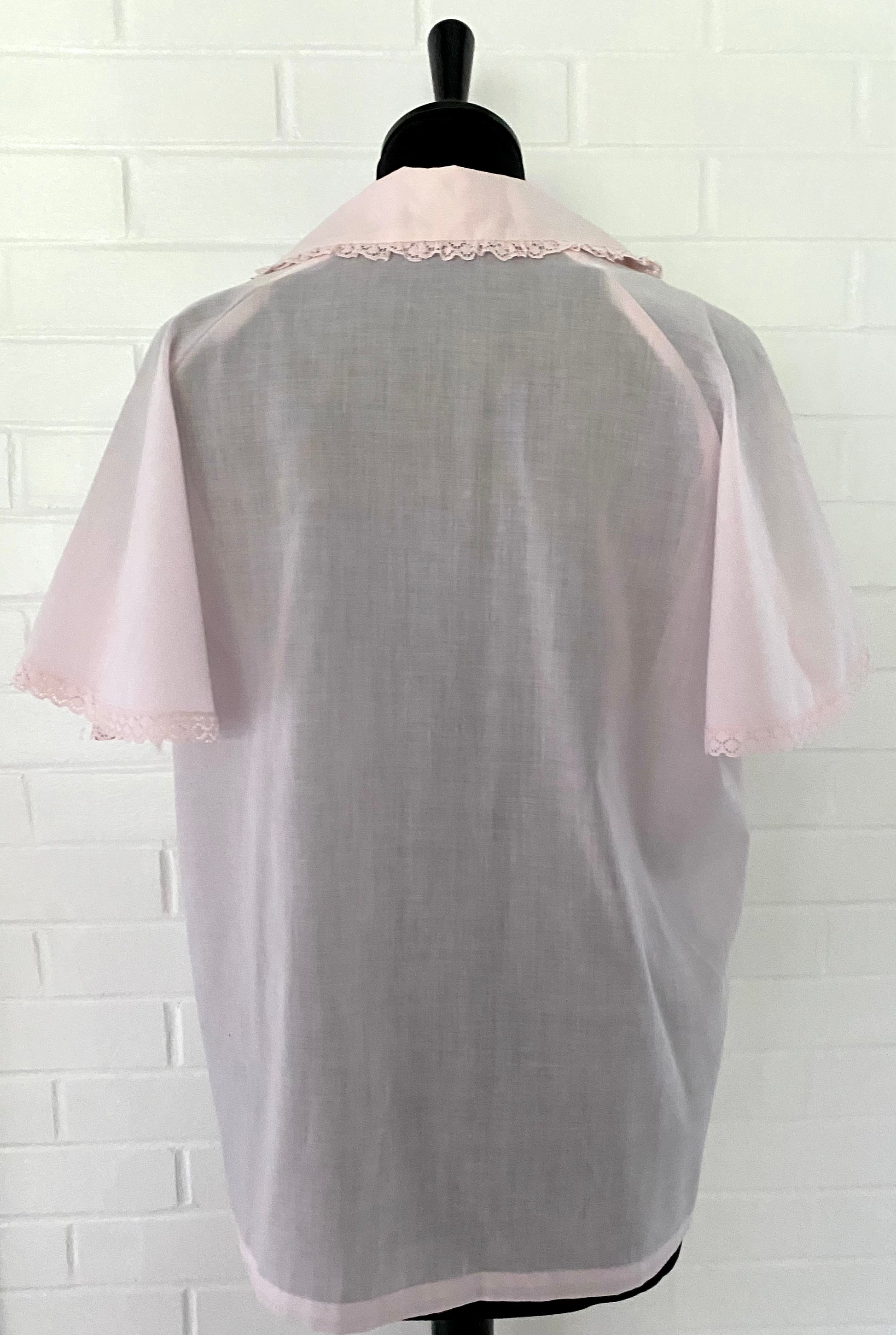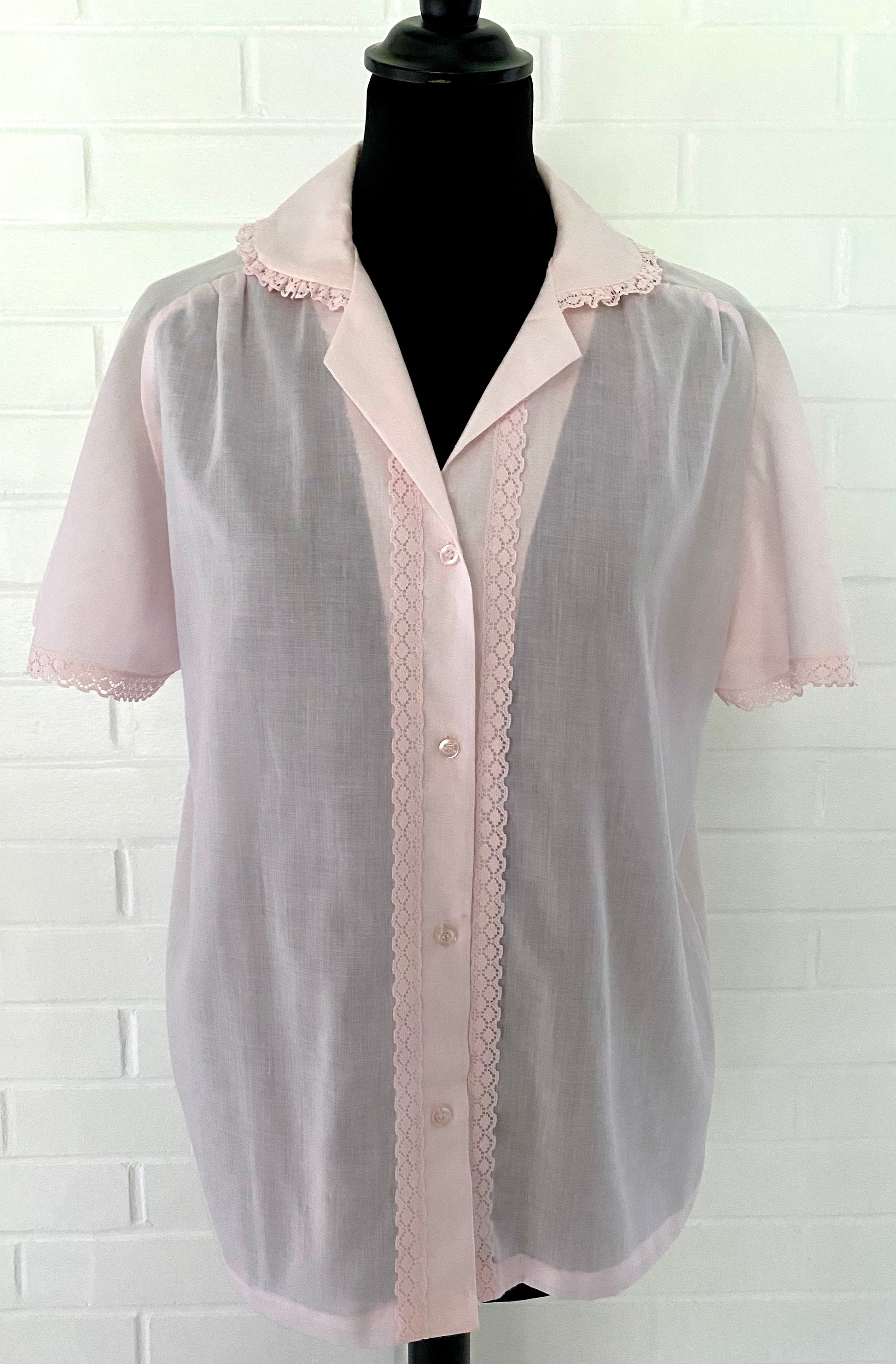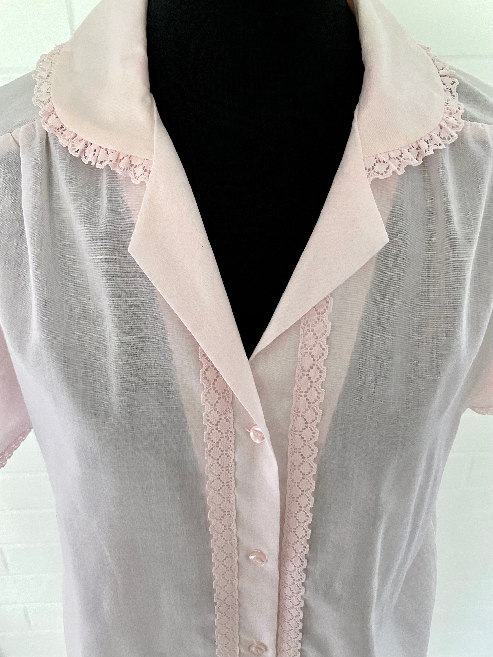 Style: This button blouses has a shirt collar and a button front entry with small lace trim around the edges. The sleeves are saddle style (or epaulet) and short and have full the lace trim is also around the sleeve openings.